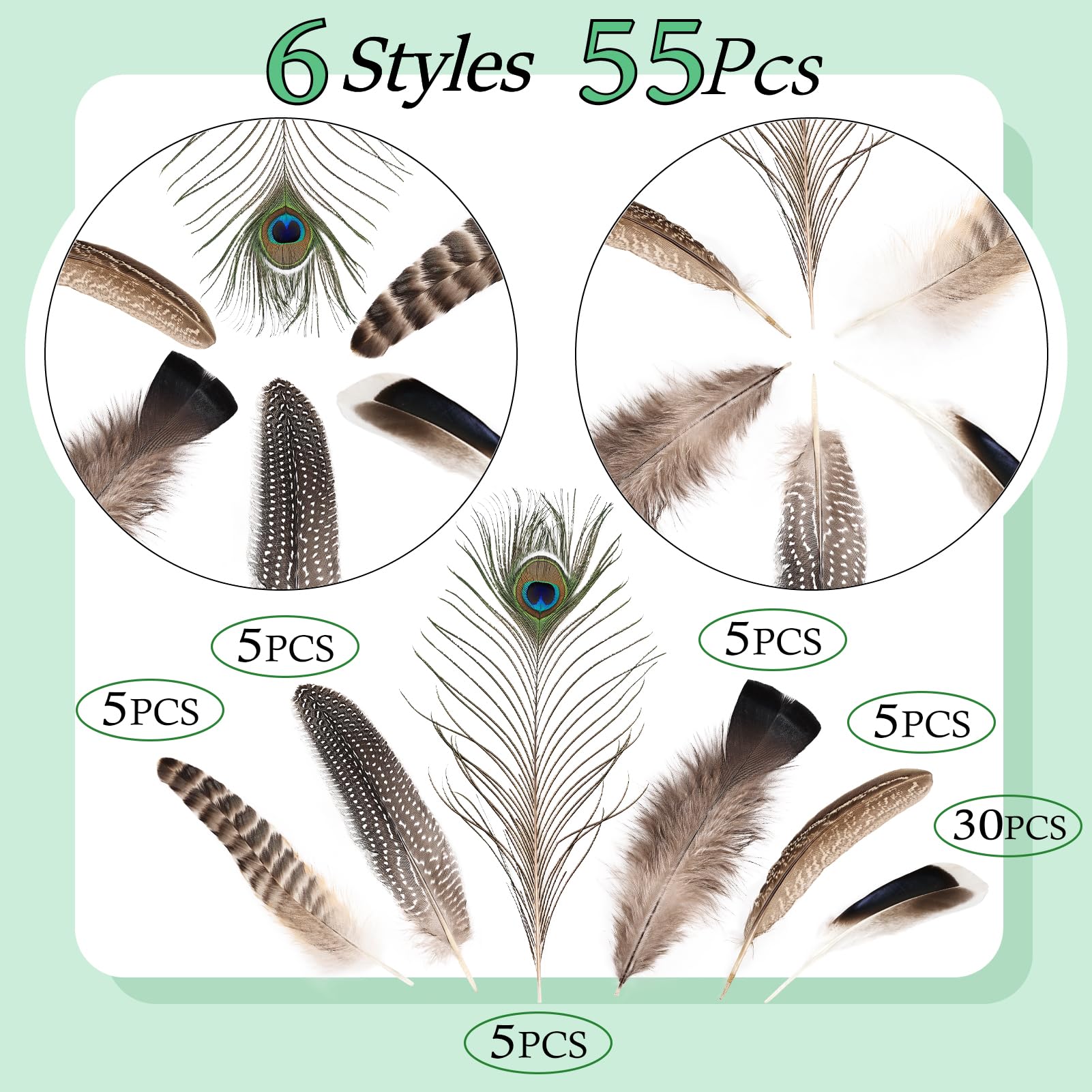 6 Styles 55pcs Natural feathers: A pack of 55pcs mixed natural feathers in 6 different styles. Perfect for DIY Crafts, Wedding, and Crafting supplies