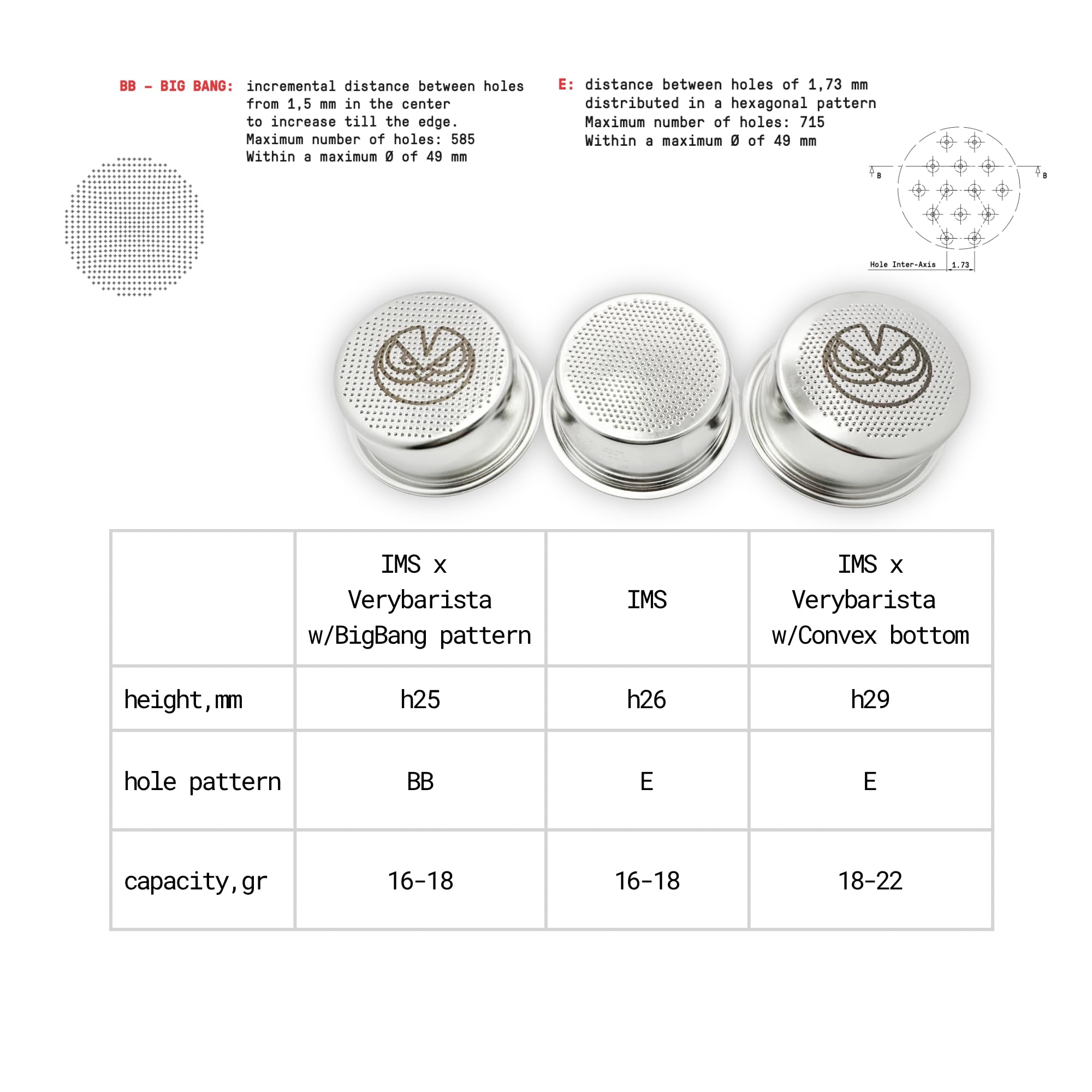Shape of basket and hole pattern matches all types of coffee roasts-from dark to light roasted. Result: emphasized fruitiness, more body, more crema. (IMS - "E" design pattern)