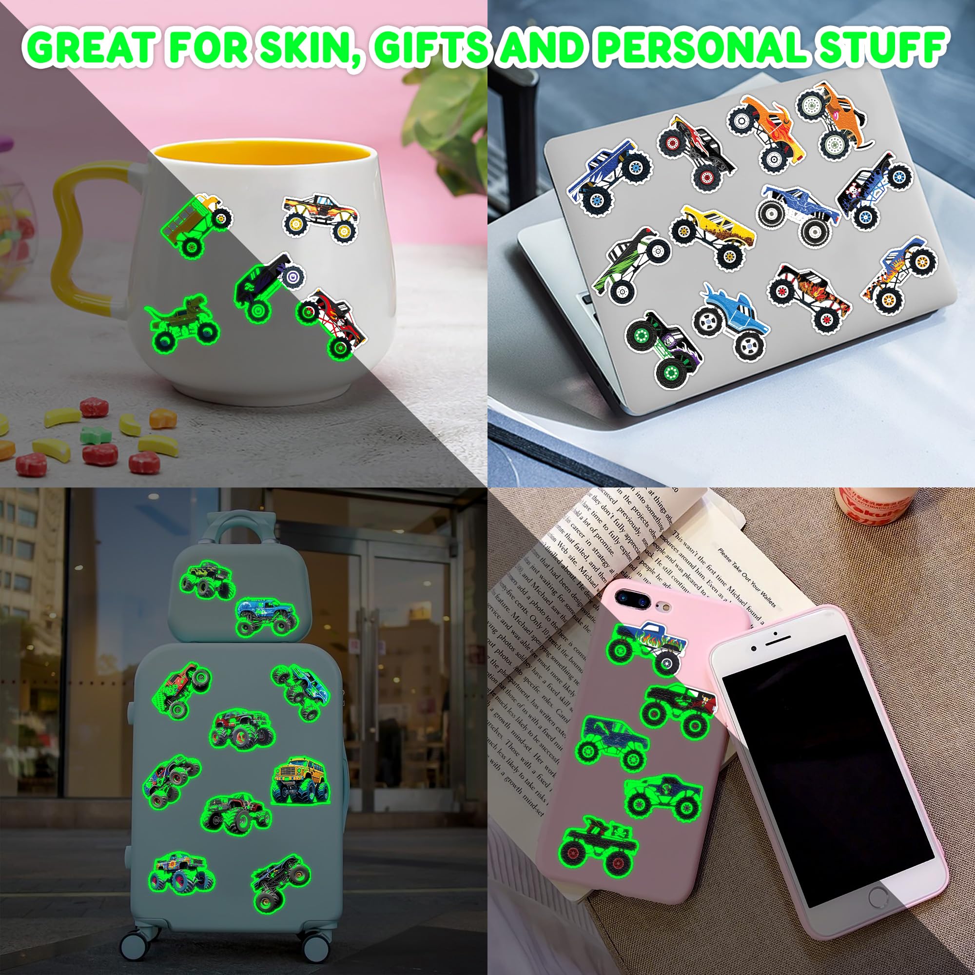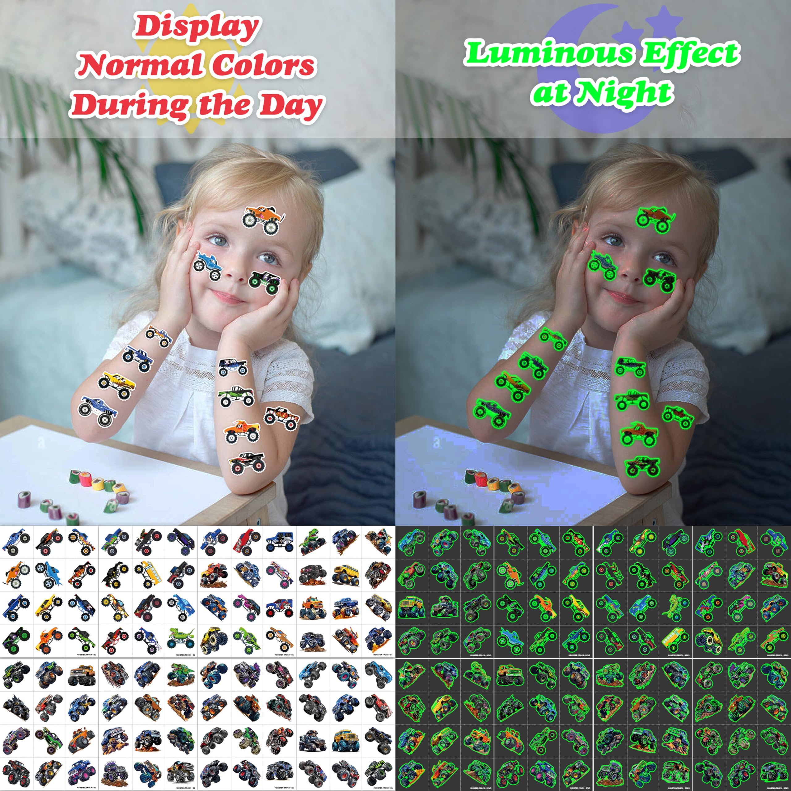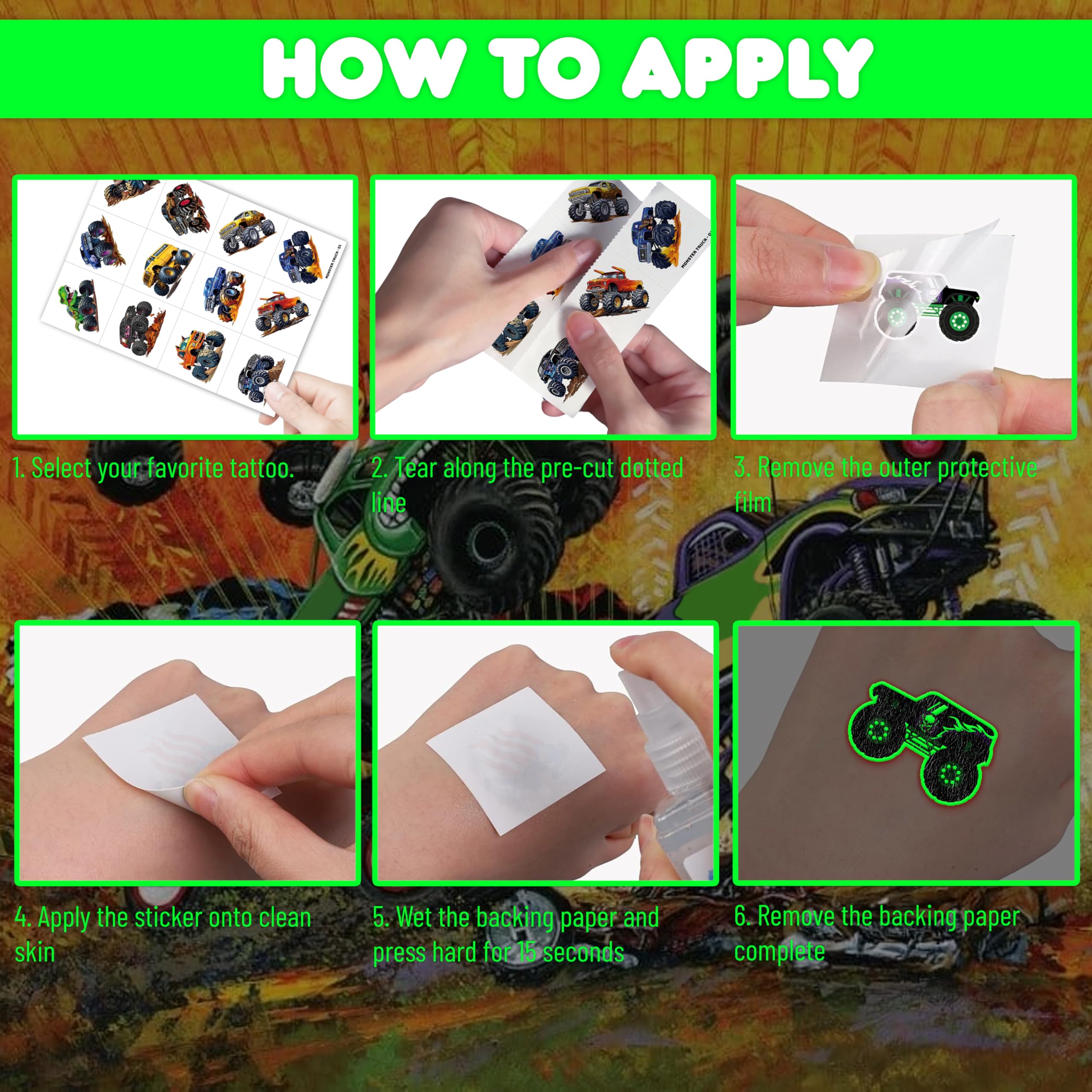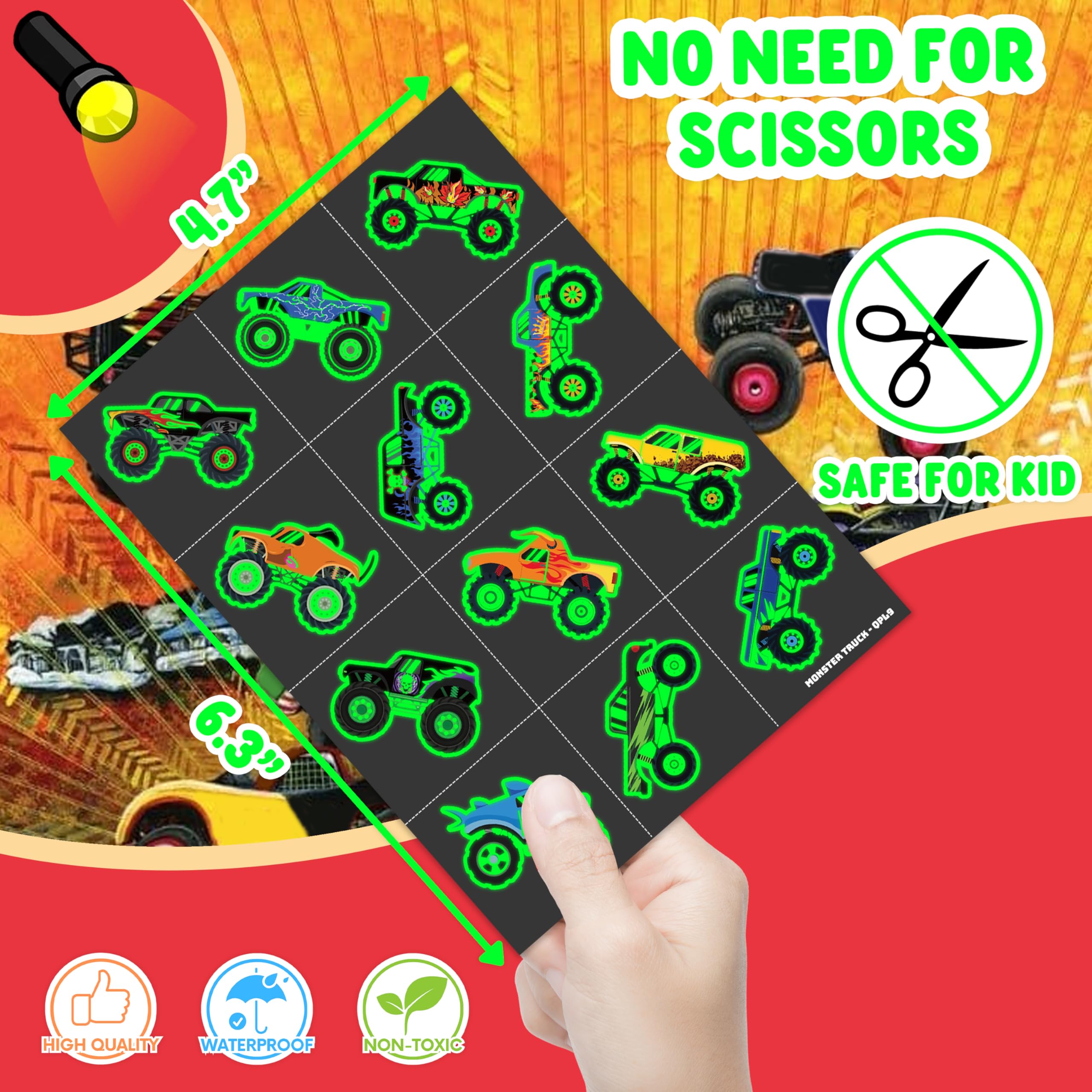 Perfect for Monster Truck Trucks Car Race Racing Car Birthday Party Decorations Supplies & Events: Great for themed parties, birthday activities, school rewards and other party events. These luminous tattoo stickers can be applied on arms, hands, face, neck, shoulders... to make you look cool and stand out at all kinds of parties. A popular hit with your kids. You can also apply them to smooth objects such as glass, laptops, paper, cups, bottles… to create a glowing party vibe.