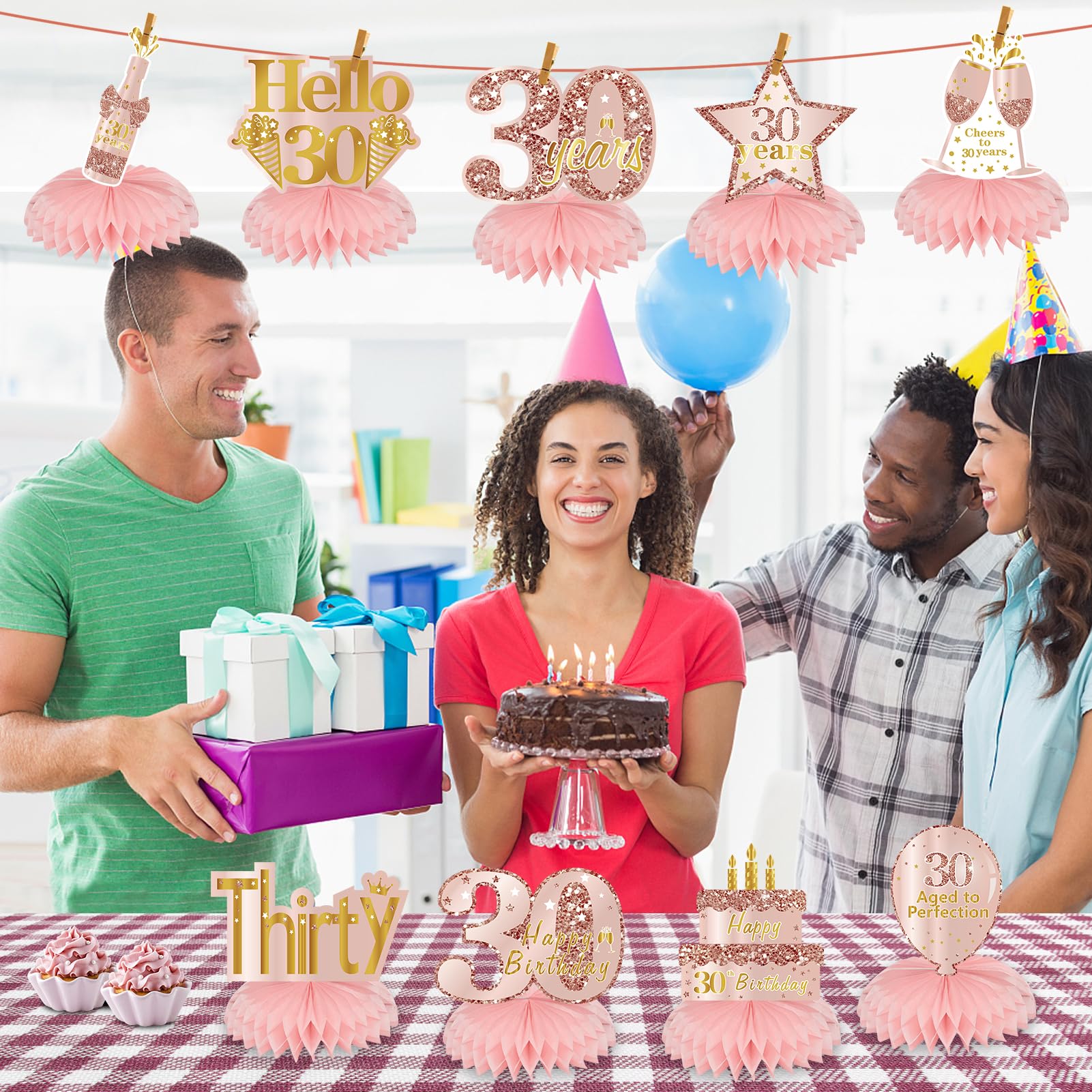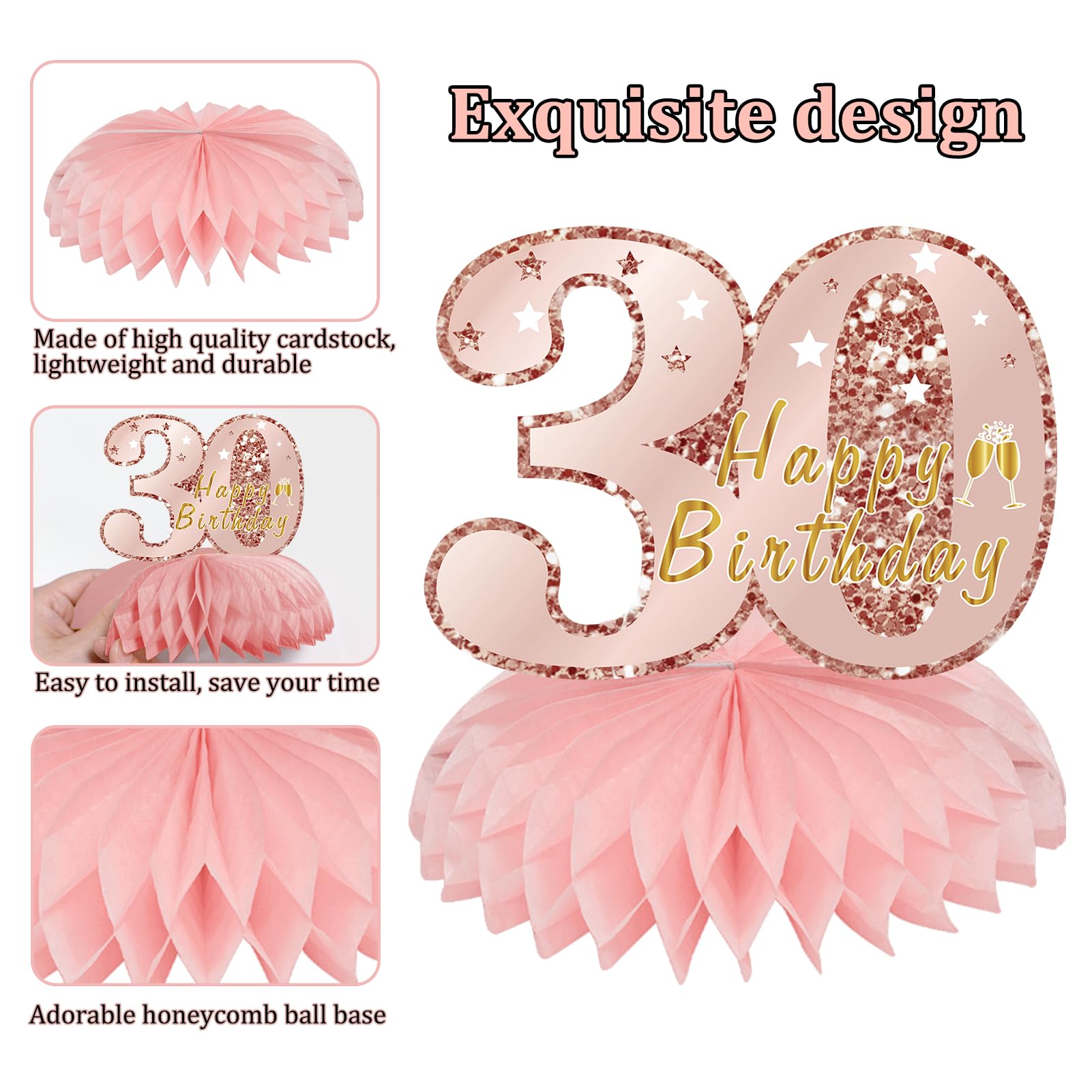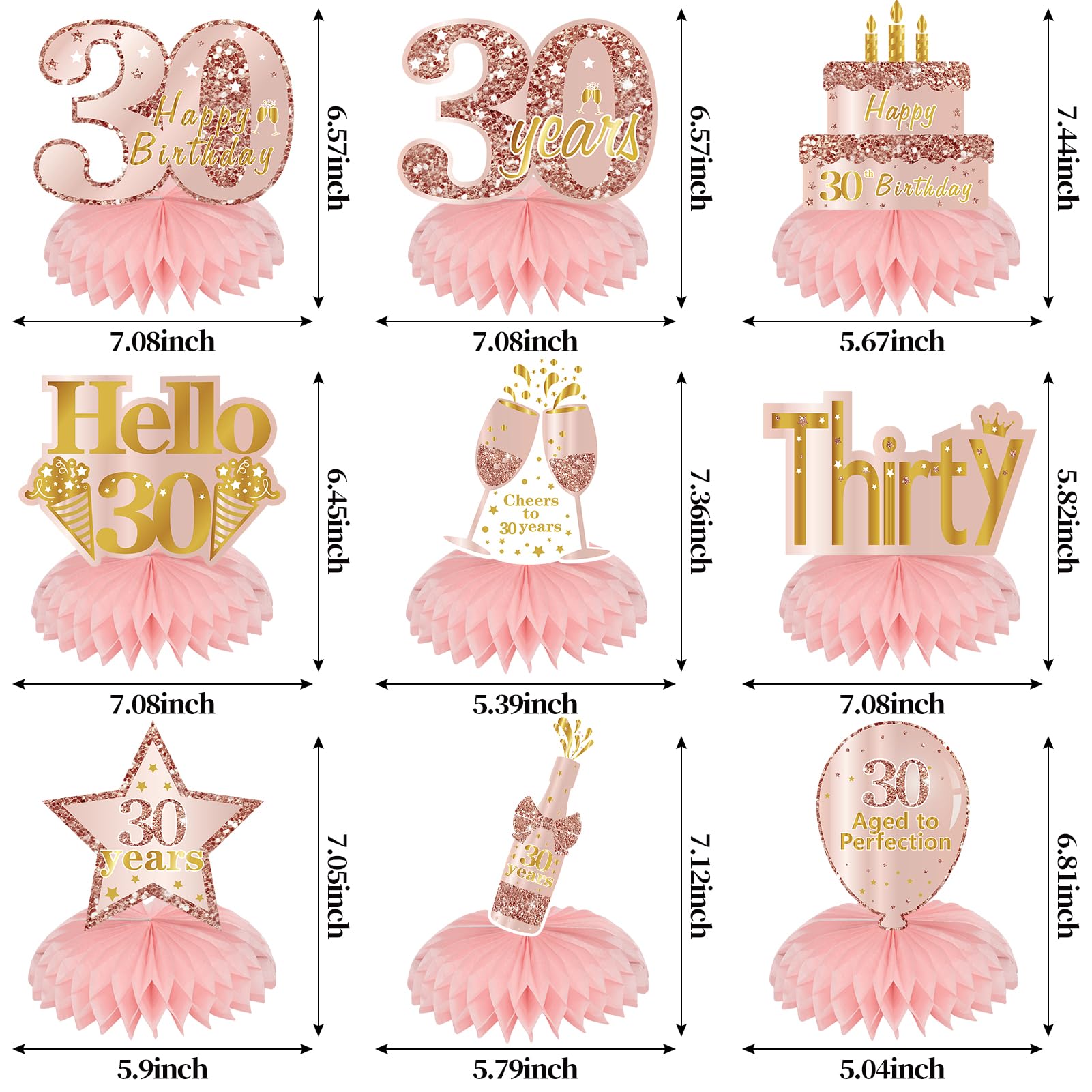 [You will get] - 9Pcs set of Pink Rose Gold 30th birthday honeycombs centerpieces decorations, including 9 birthday theme cardboard and 9 paper honeycomb balls, which are very suitable for your 30th birthday party decoration.