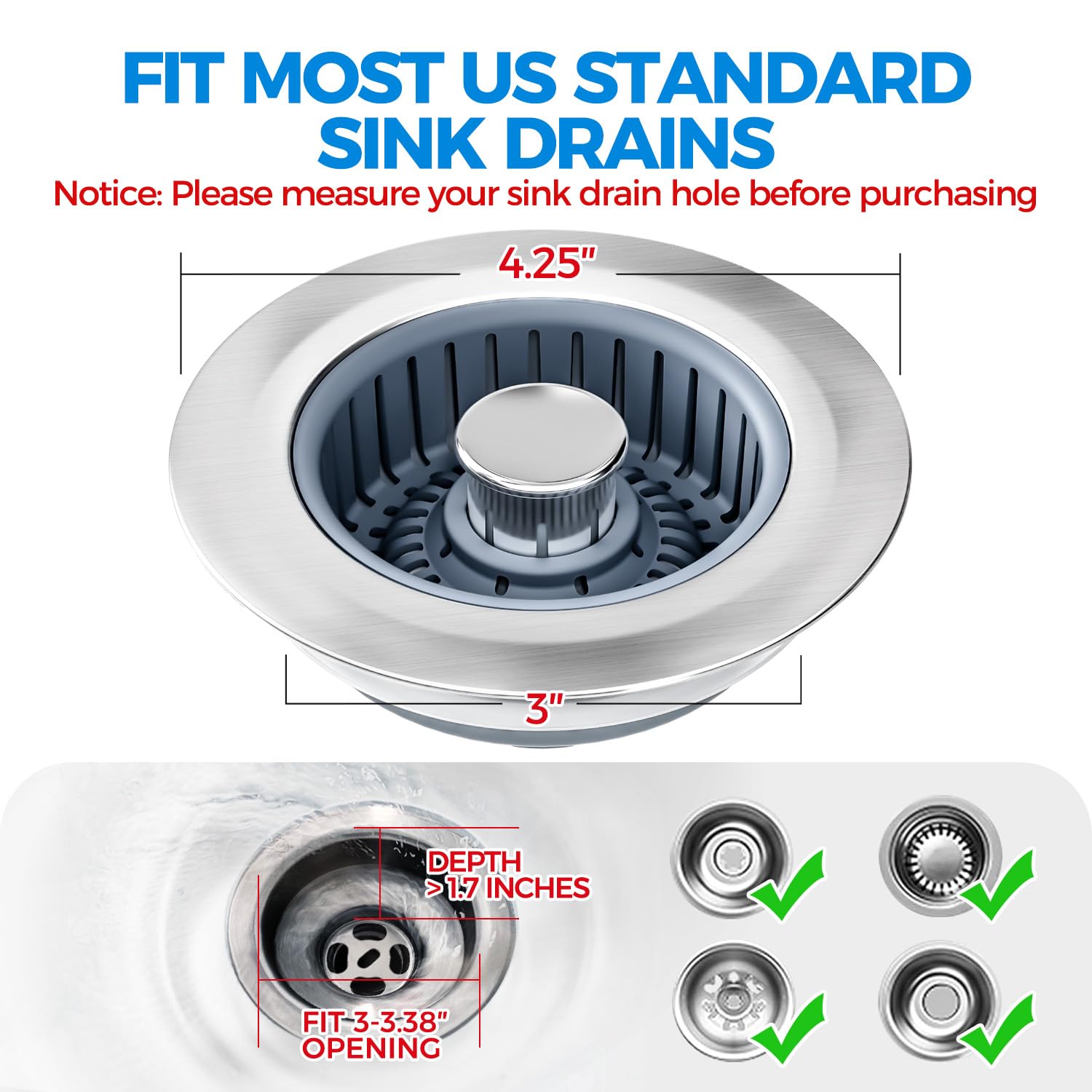 【Universal Compatibility to US Standard Sink Drains】This kitchen sink stopper measures 3"-3.38", fit most US standard 3-1/2 inch drain hole. Please measure your sink drain hole size before purchasing