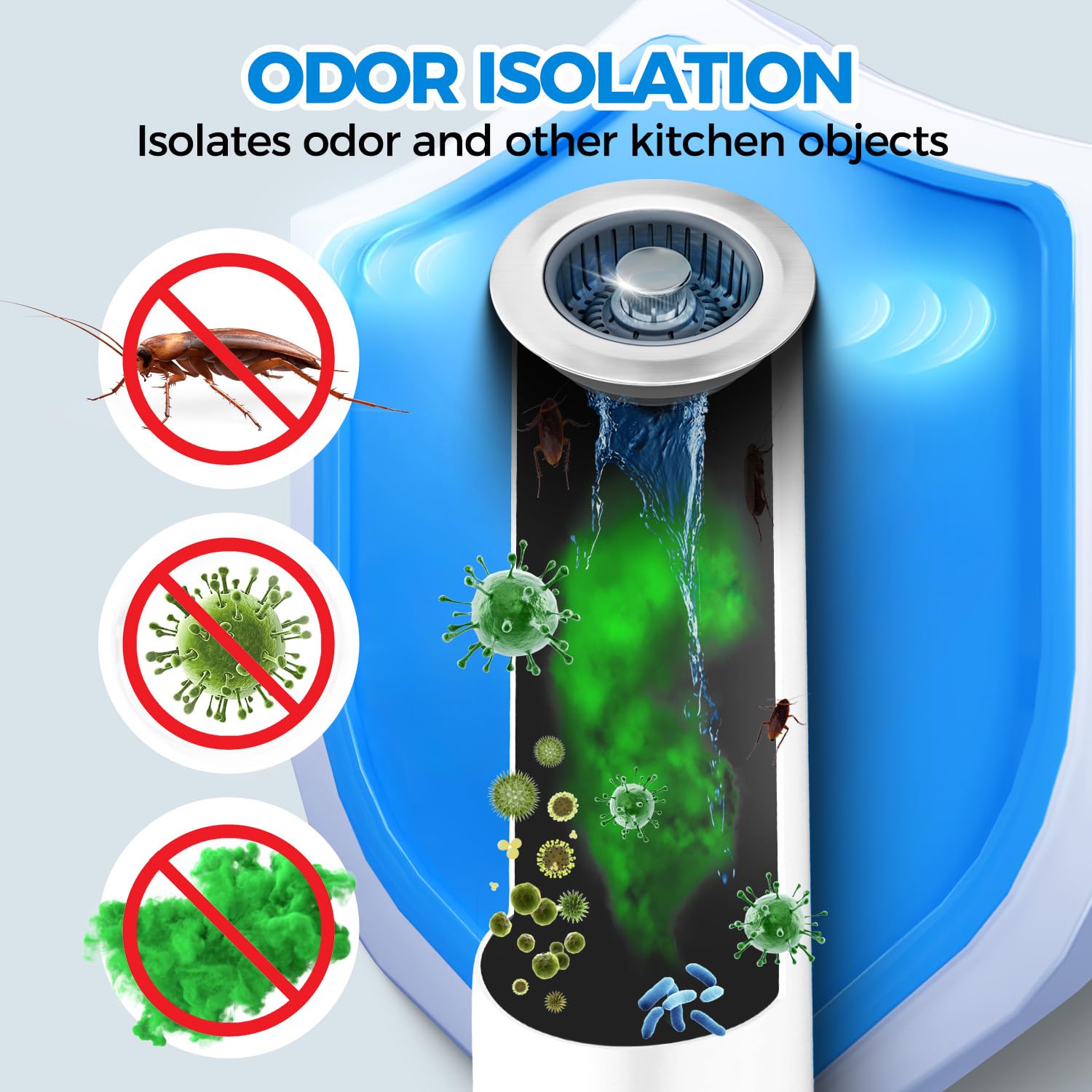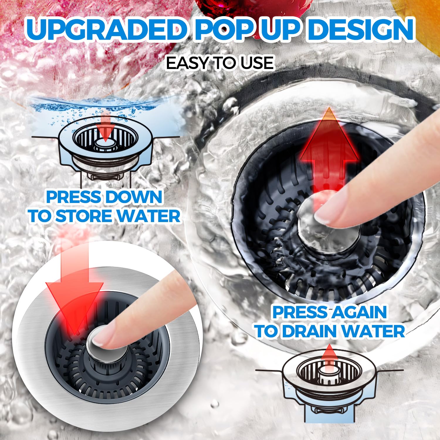 【Upgraded 3 in 1 Kitchen Sink Drain Strainer】Our kitchen sink strainer, combines sink drain strainer, kitchen sink stopper and odor isolation together. Press down the pop up button to store water for washing, press again to drain water while catching food waste or scrap from going down the drain. A reliable anti clogging helper and a must have kitchen sink installation parts