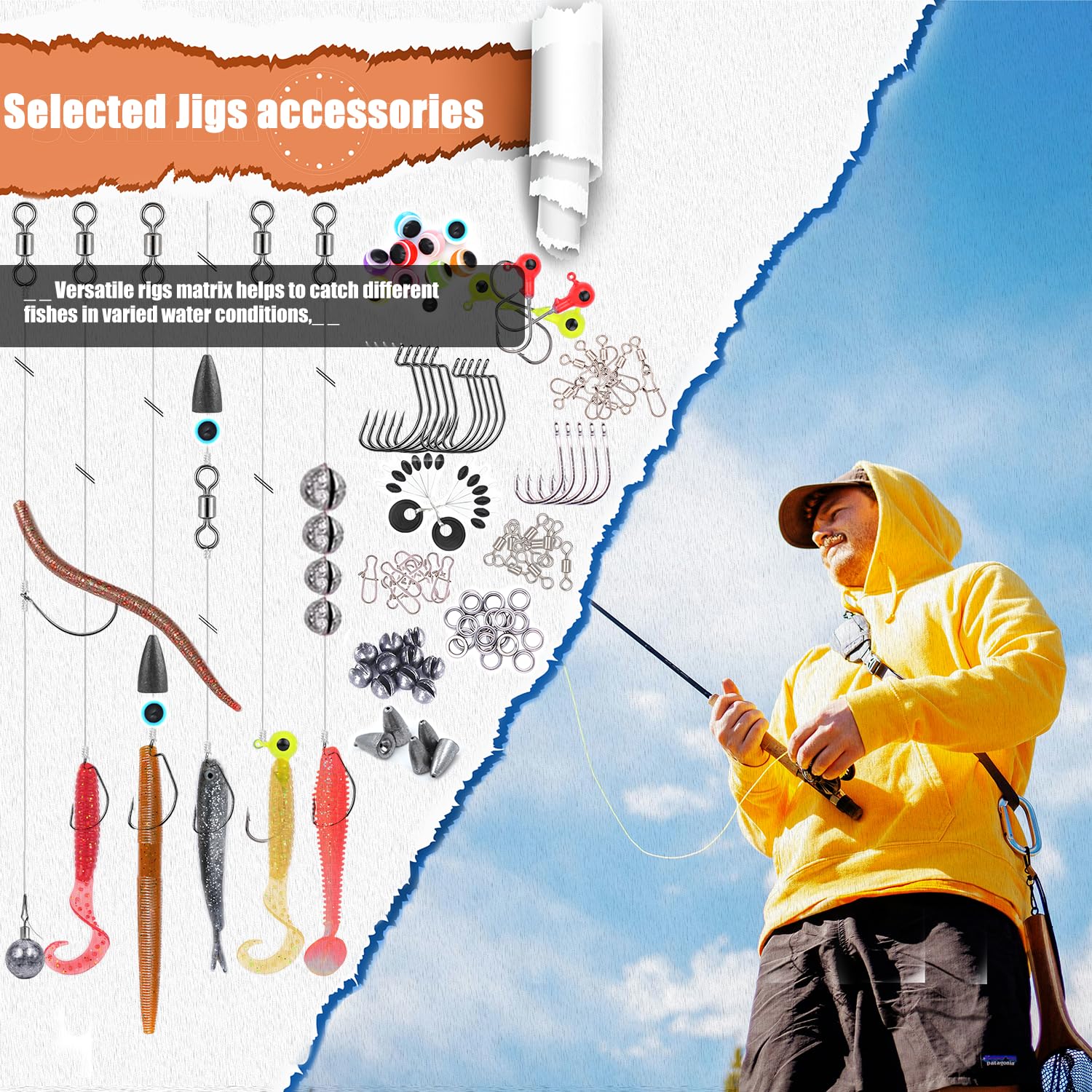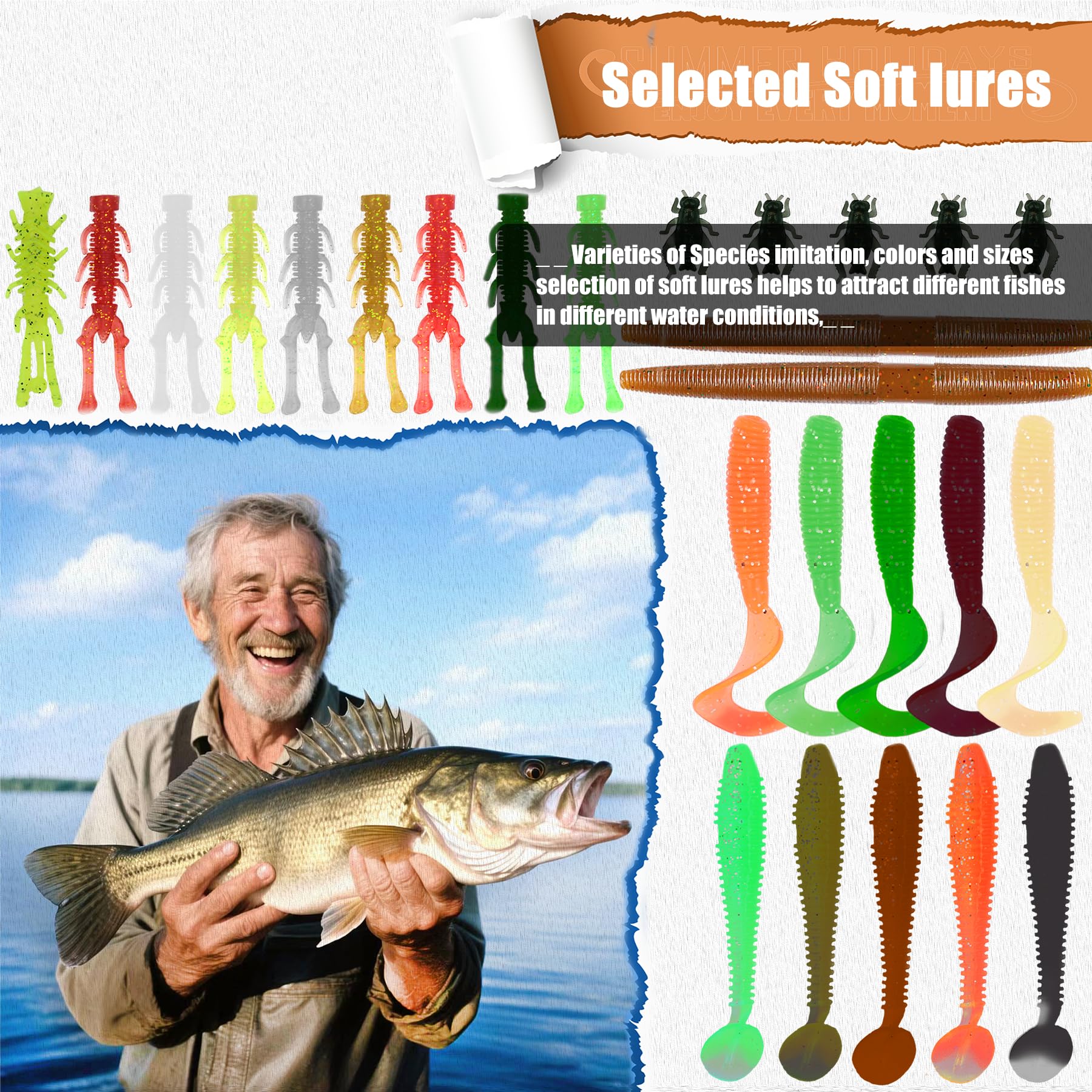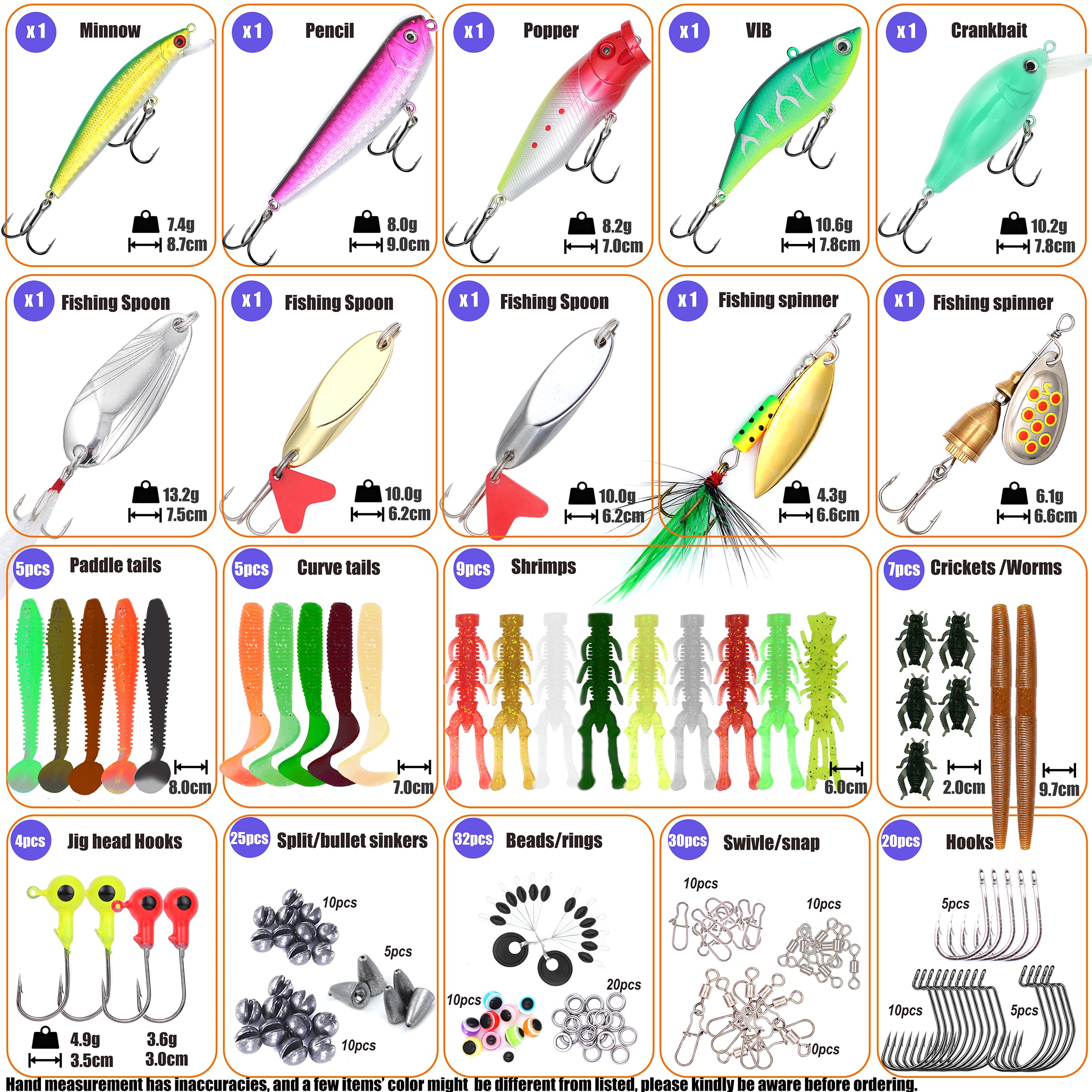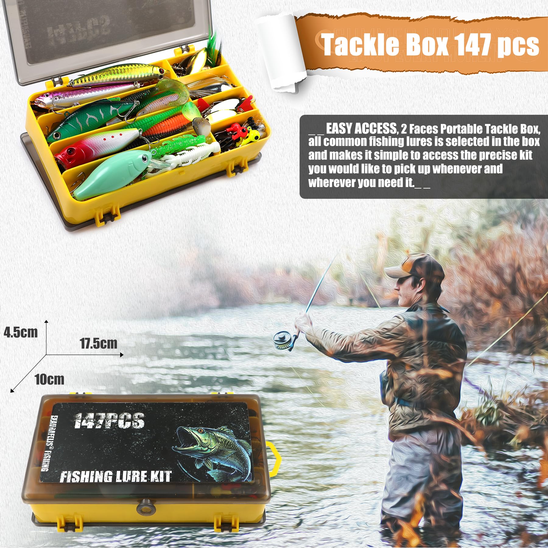 Various fishing baits: 147pcs of fishing lures set in a tackle box with all the necessary fishing bait and accessories. From minnows and poppers to soft plastic worms, jig heads, hooks, weights, multi-functional plier, and more. This set is perfect for both freshwater and saltwater fishing.