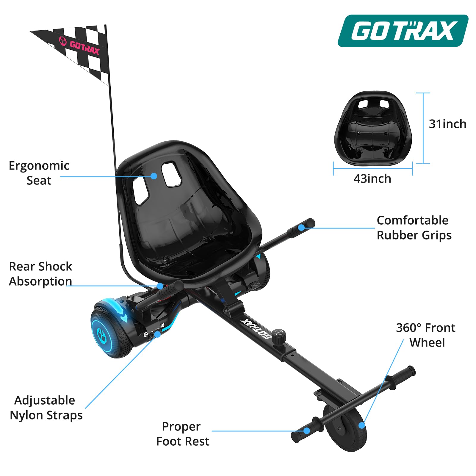 HOVERBOARD GO KART - Easily convert your hoverboard into a go-kart with Gotrax Hoverseat hoverboard seat attachment. Equipped with an ergonomic seat would be easier to keep balance and ride stable. It's an all new way to have fun with your favorite hoverboard. Note: Hoverboard not included, If you have any questions or need help, please contact us without hesitation, we will handle it within 24 hours.