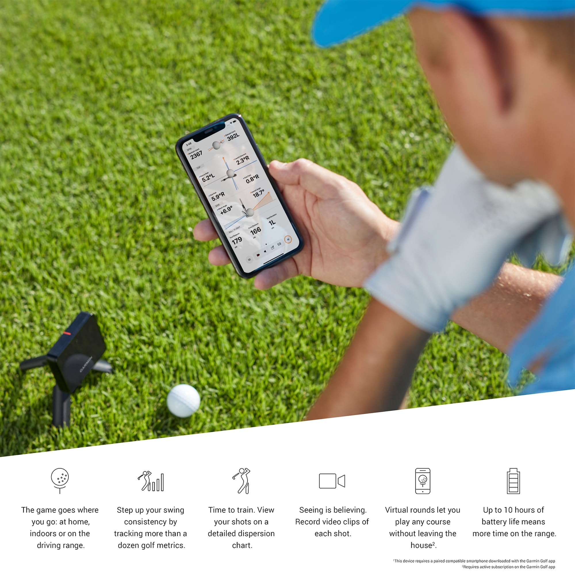 Enjoy more time on the range with up to 10 hours of battery life. Understand your golf strengths and areas for improvement by using training mode, which tracks stats for each club and shows a shot dispersion chart based on estimated ball flight using the Garmin Golf app