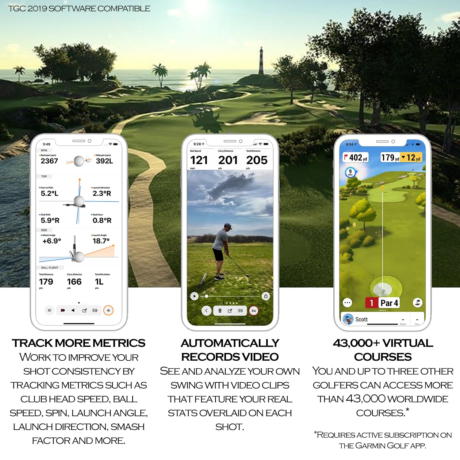 You are up to three other golfers can likely play your own home course or even a course you're going to play on your next trip with virtual rounds for more than 43,000 worldwide courses. See and analyze your own swing with automatically recorded video clips that include the metrics of that swing when paired with a compatible smartphone with the Garmin Golf app