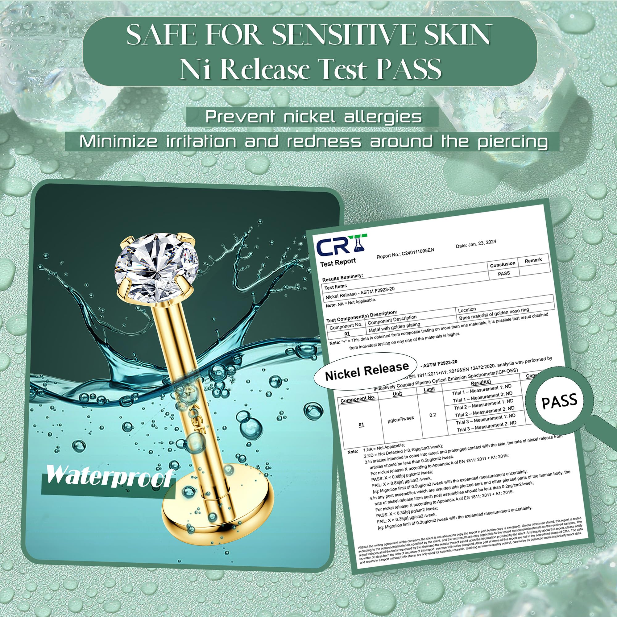 Threadless Push in Nose Rings:Gauge size: 20G(0.8mm) Bar Length: 6mm/7mm/8mm, CZ Diameter: 1.5mm,2mm,2.5mm,3mm, Color: 14K gold plated . Material: 316L stainless steel.One order includes 8PCS Labret Posts (3 different length ),8PCS different size of Threadless Ends, 1PCS Taper Insertion Pin. ONE LABRET POST TO FIT ALL THESE THREADLESS ENDS
