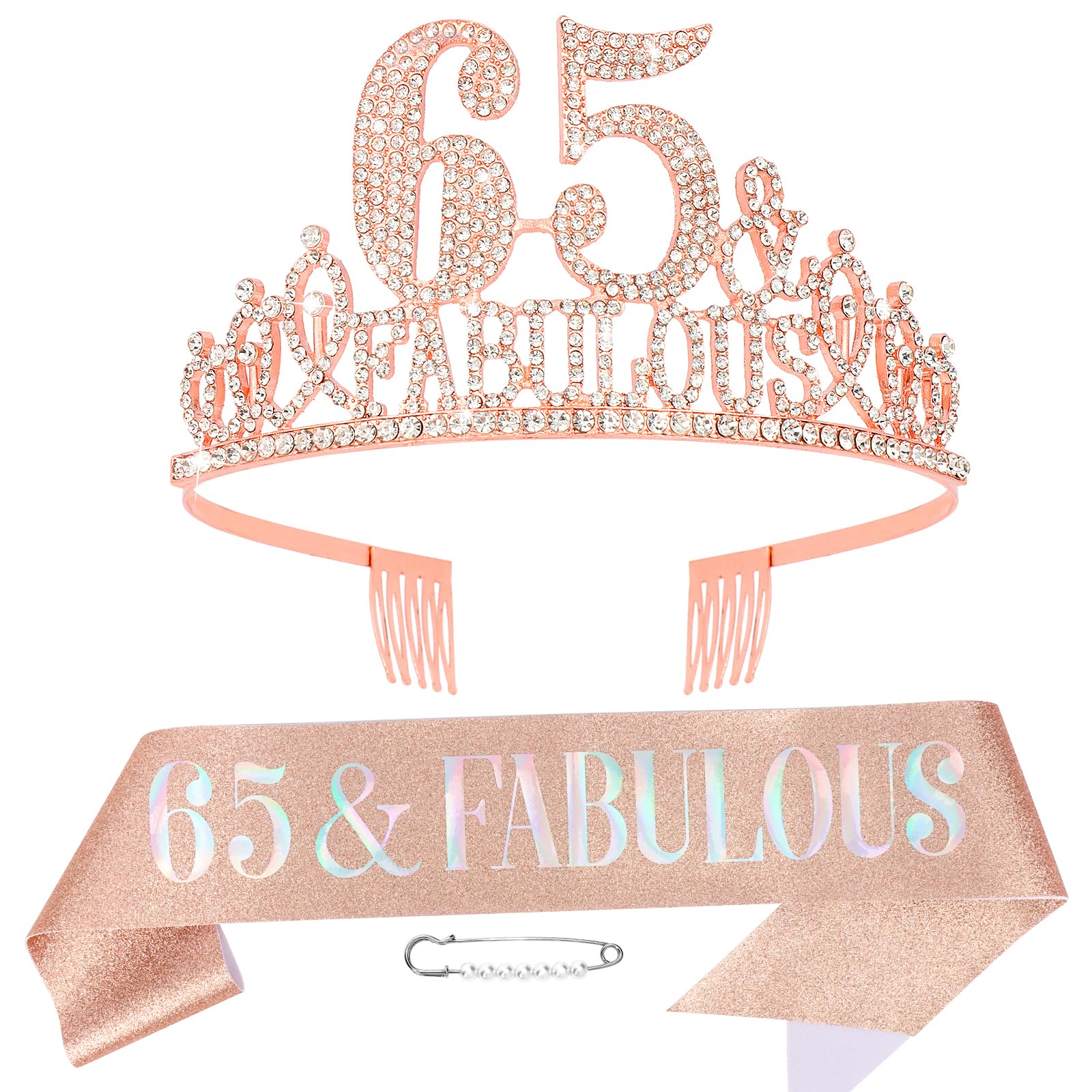 Exquisite Design: Featuring iconic birthday elements like a crown, gift box, star, and cake, with sweet rose pink background, eye-catching "Happy 65th Birthday" with sparkling stars and rose gold pink diamond party elements design, very beautiful and innovative design, can add beautiful decoration to your birthday party.