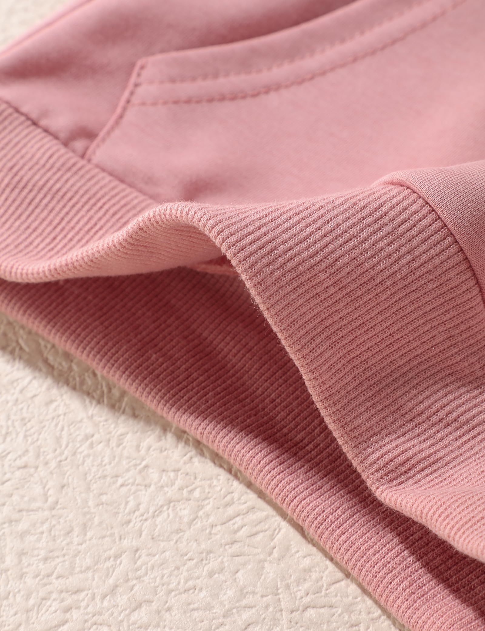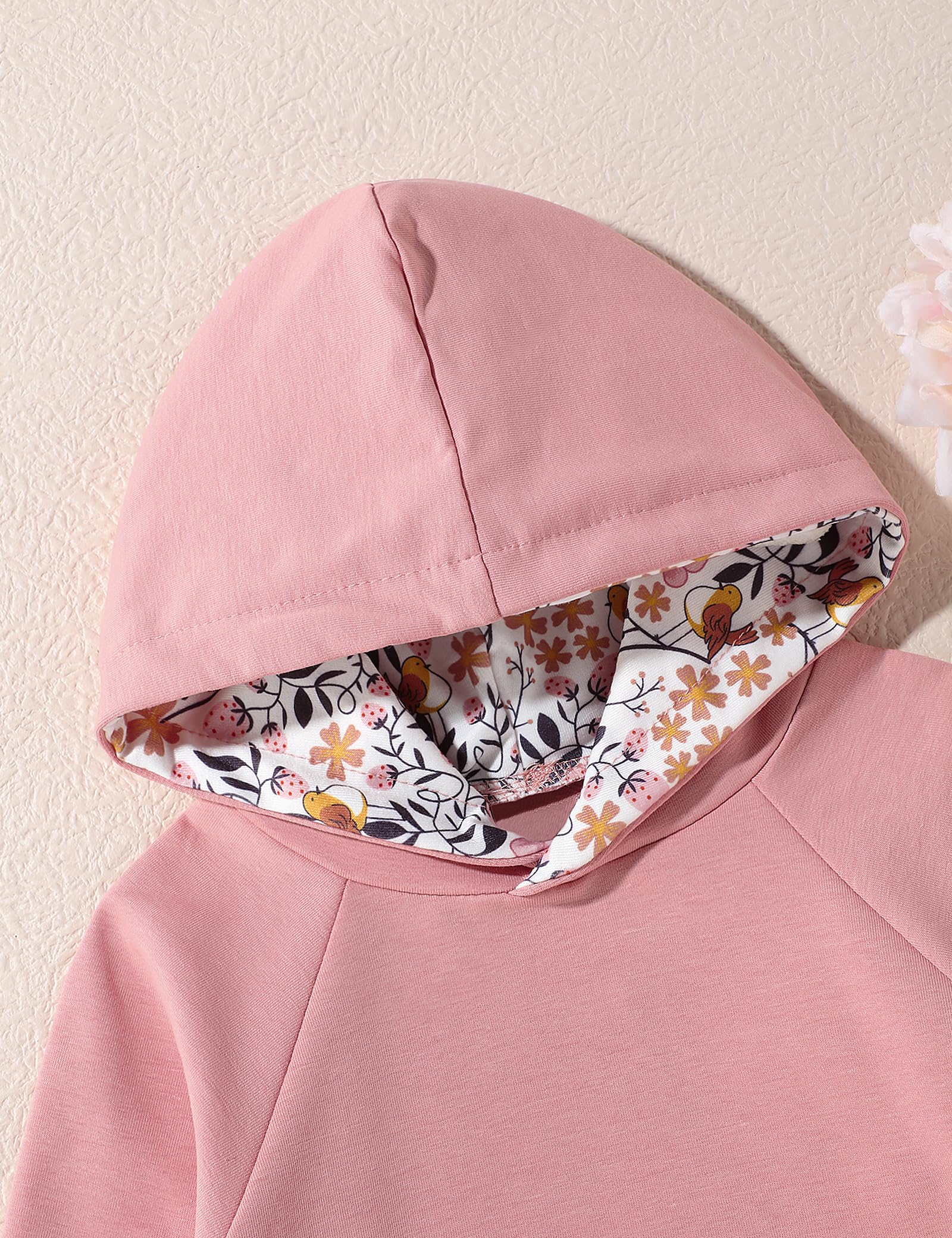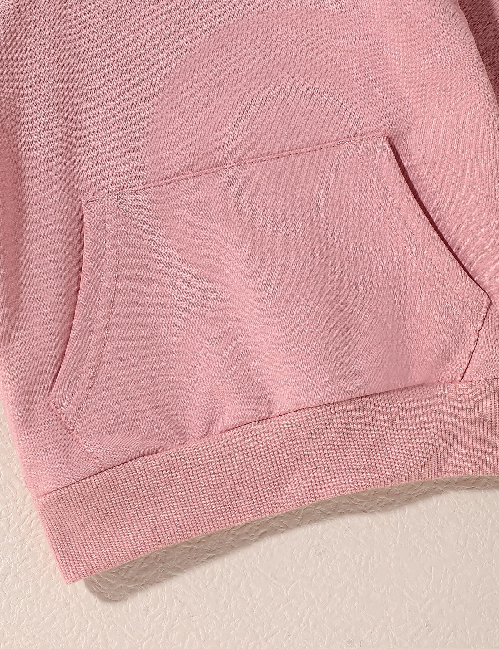 【Ingenious Design】A hooded sweatshirt in solid colors, paired with adorable kangaroo pockets, and printed trousers with an elastic waistband for easy wear. Complete with a matching printed headband