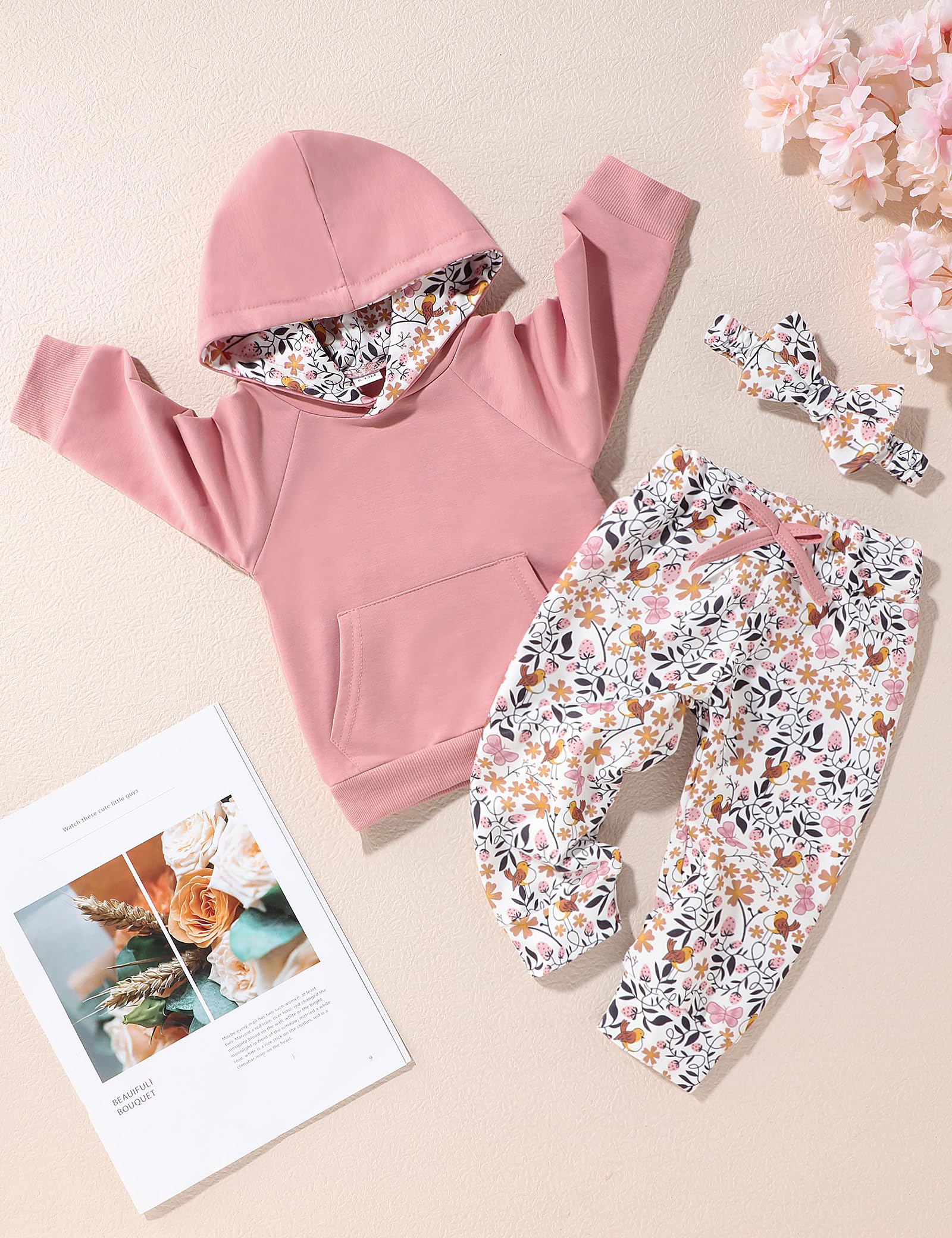 【Complete Set】This baby clothes for girls package includes 1 hooded top, 1 printed pant, and 1 cute floral headband, available in diverse designs to suit unique styles and brighten up her childhood days