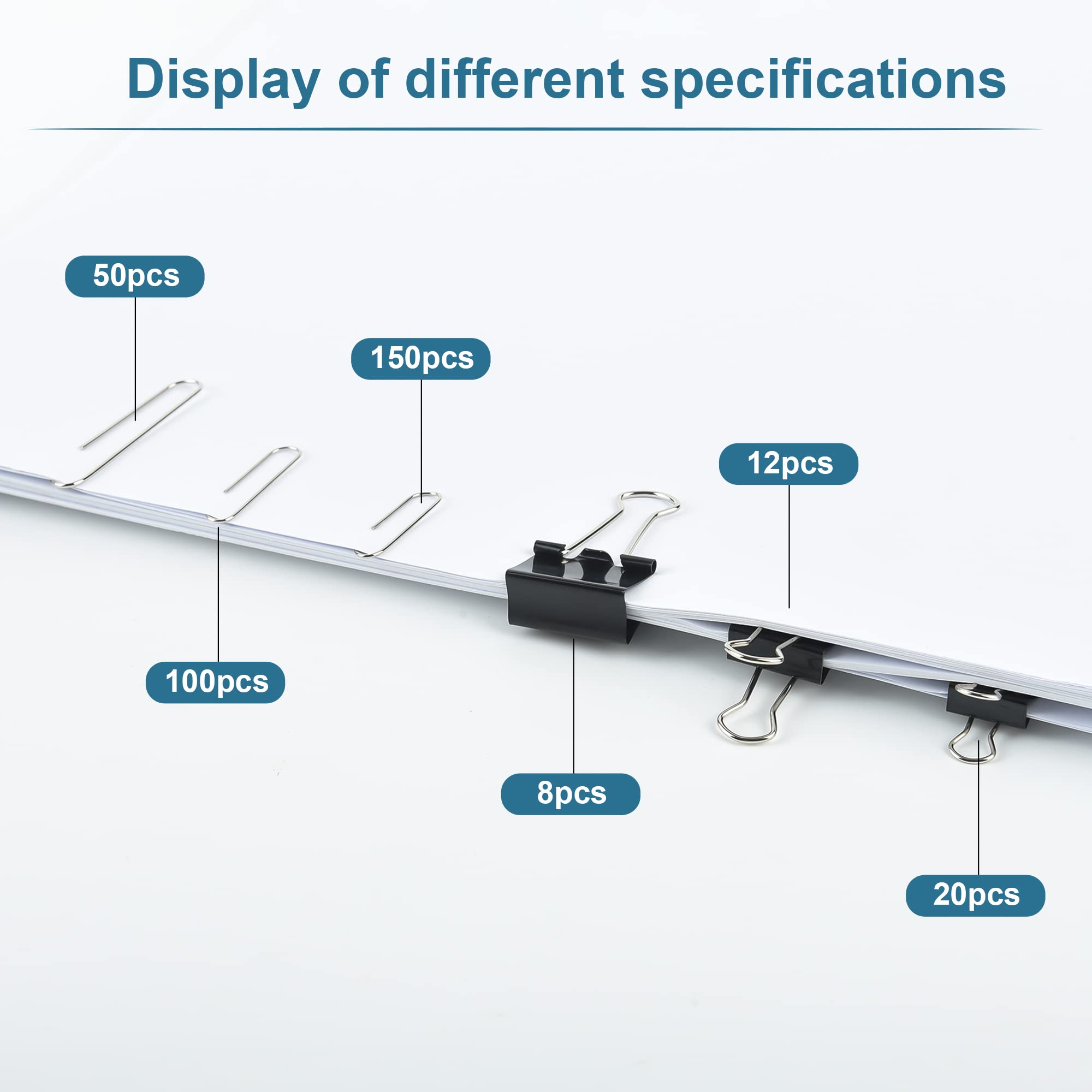 Assorted Size Meet Office Desk Accessories Need - Jumbo 340pcs binder clips and paper clips set,each pack contain 150, 100, and 50 pieces of assorted paper clips (28mm, 33mm, 50mm). Get 20, 12, and 8 pieces of the paper binder clips (15mm, 19mm, 25mm), too!