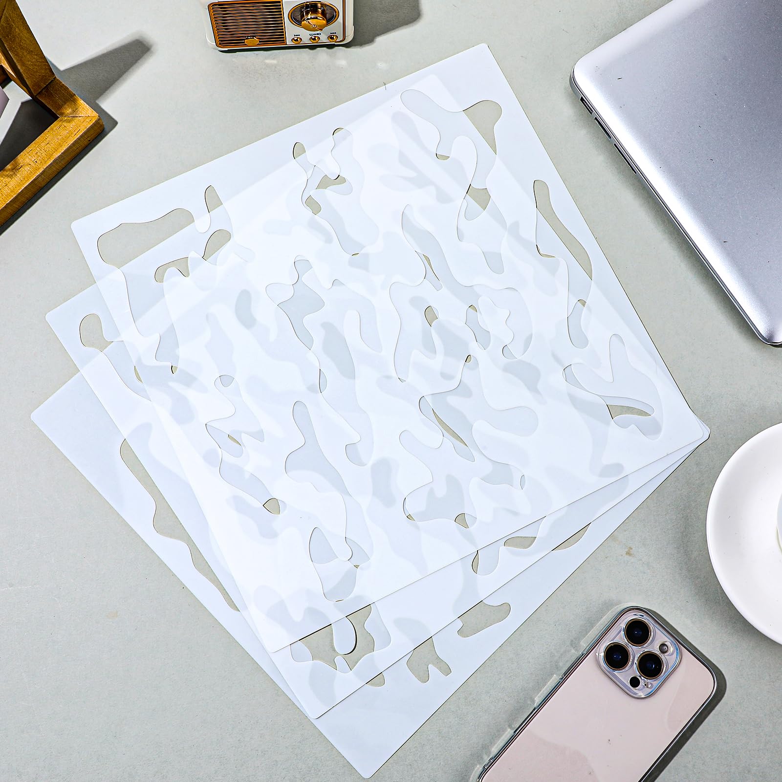1.Made from eco-friendly PET material, these stencils for painting are durable, lightweight, and safe for all ages. Our camo stencils for spray paint are designed for repeated use. 2.Using these spray paint stencils is easy and efficient. Simply place the stencil on a flat surface, secure it with temporary adhesive, and apply your chosen paint using a brush or airbrush. Remove the stencil to reveal your artwork. Specifications: Category: Hollow painting template Color: White Style: Camouflage stripes Material: PET Function: Hollow painting template Product size: 11.81 × 11.81 × 0.03 inches/30 × 30 × 0.1 cm Package content: 3pcs × template