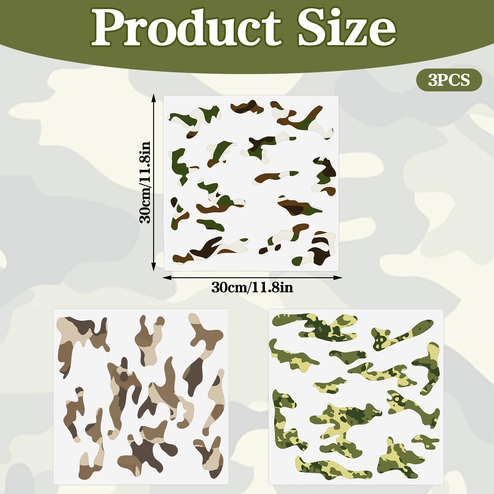 【3 Pcs Camo Stencils】This set includes 3 pieces of 11.8x11.8 inch camo stencils for spray paint, perfect for creating unique woodland camo patterns. These stencils for painting are ideal for various surfaces such as wood, canvas, paper, fabric, floor, and tile. Unleash your creativity with these versatile spray paint stencils.