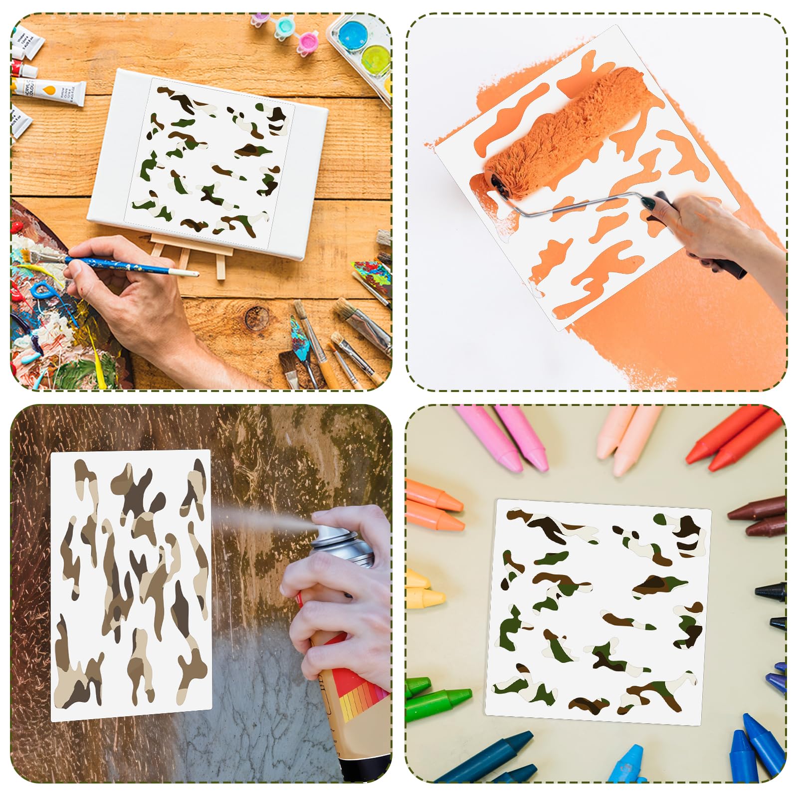【Wide Application】These camo stencils are perfect for a variety of DIY projects. Use them as wall stencils for painting large patterns, or apply them to wood, canvas, furniture, floors, and more. Create stunning home decor, festival cards, fabric paintings, and other crafts with these versatile woodland camo stencils.