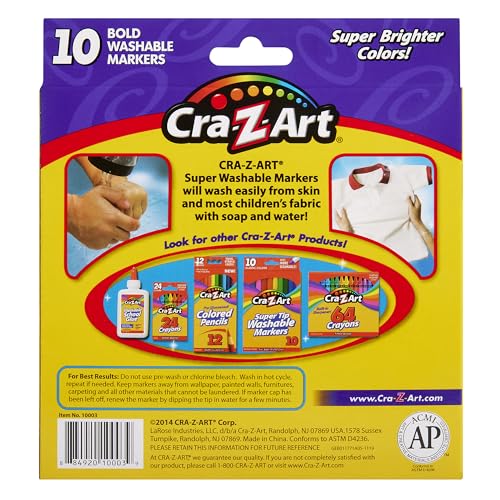 Create exciting crafts and versatile projects with these Cra-Z-Art Bold Markers. They come in a pack of 10 with different assorted bright, bold colors. These washable markers are non-toxic and easy to wipe away from most surfaces. They are ideal for home and classroom use.