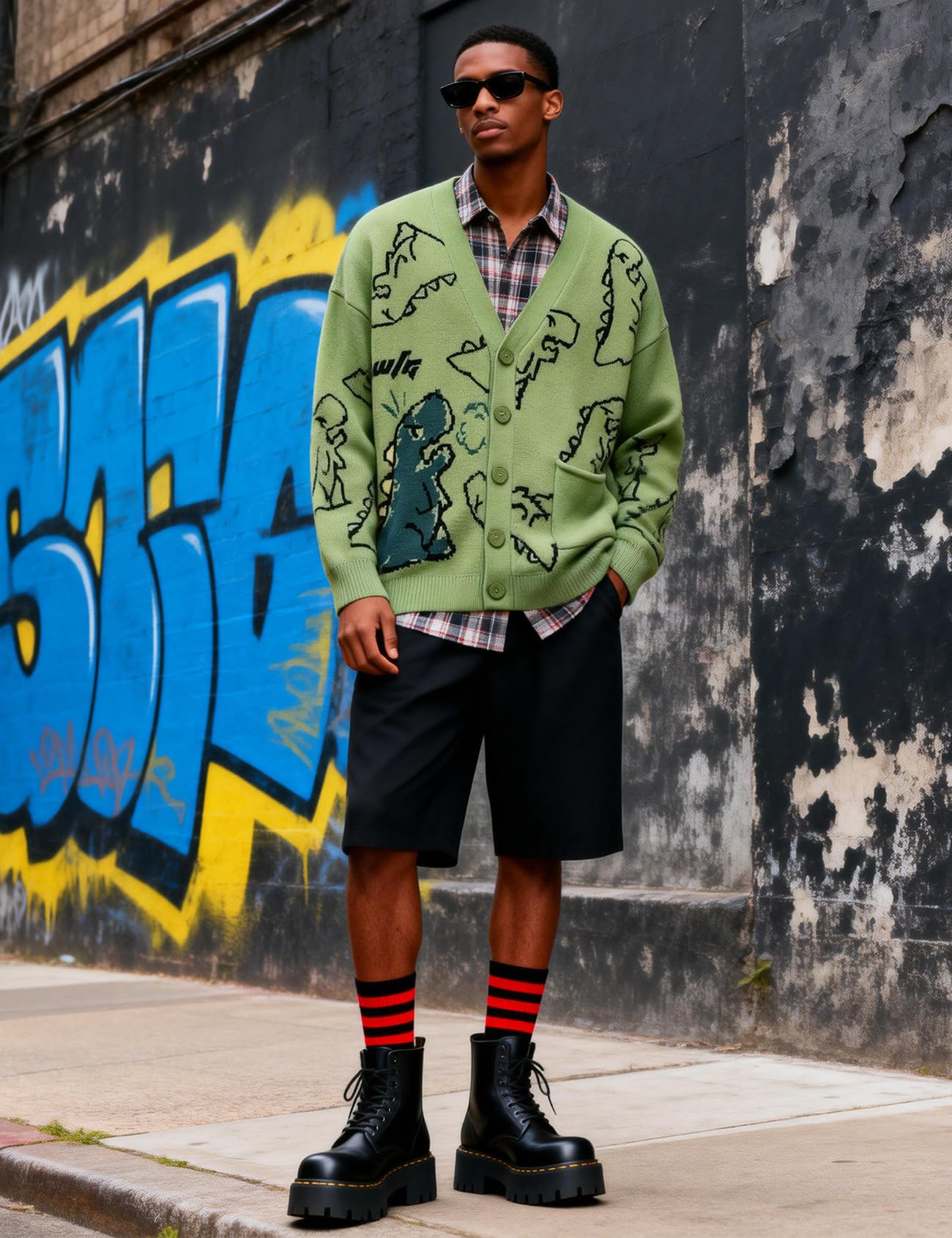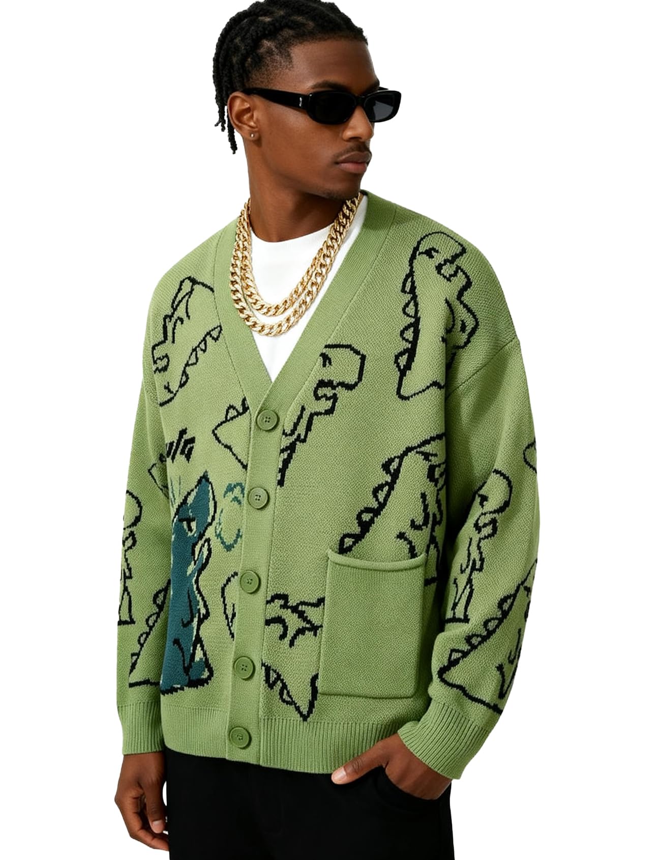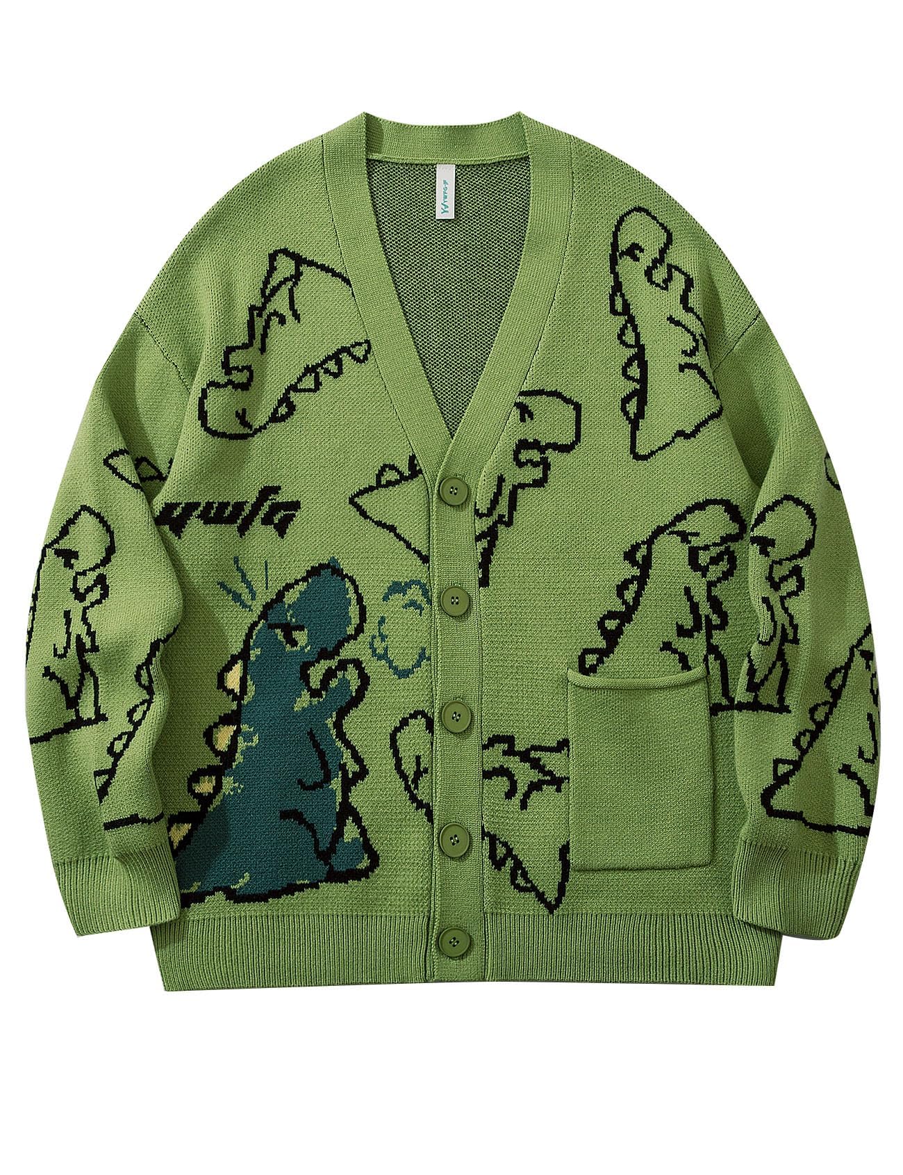 Features: Mens knit sweater, aesthetic sweater, with classic v neckline, front button down, dinosaur print, colorblock, long sleeve, ribbed cuffs and hem, loose fit, boyfriend unisex style, green Christmas sweater