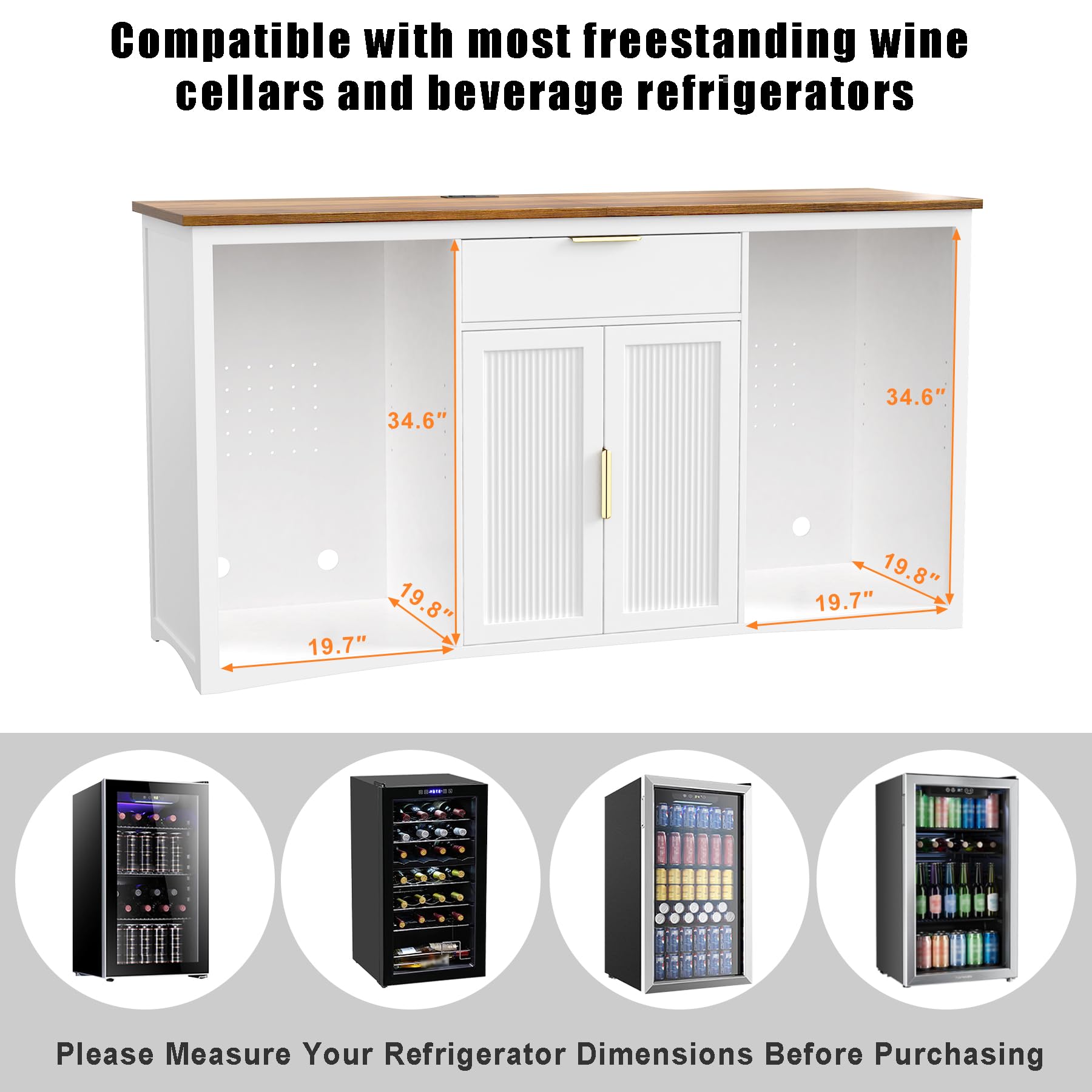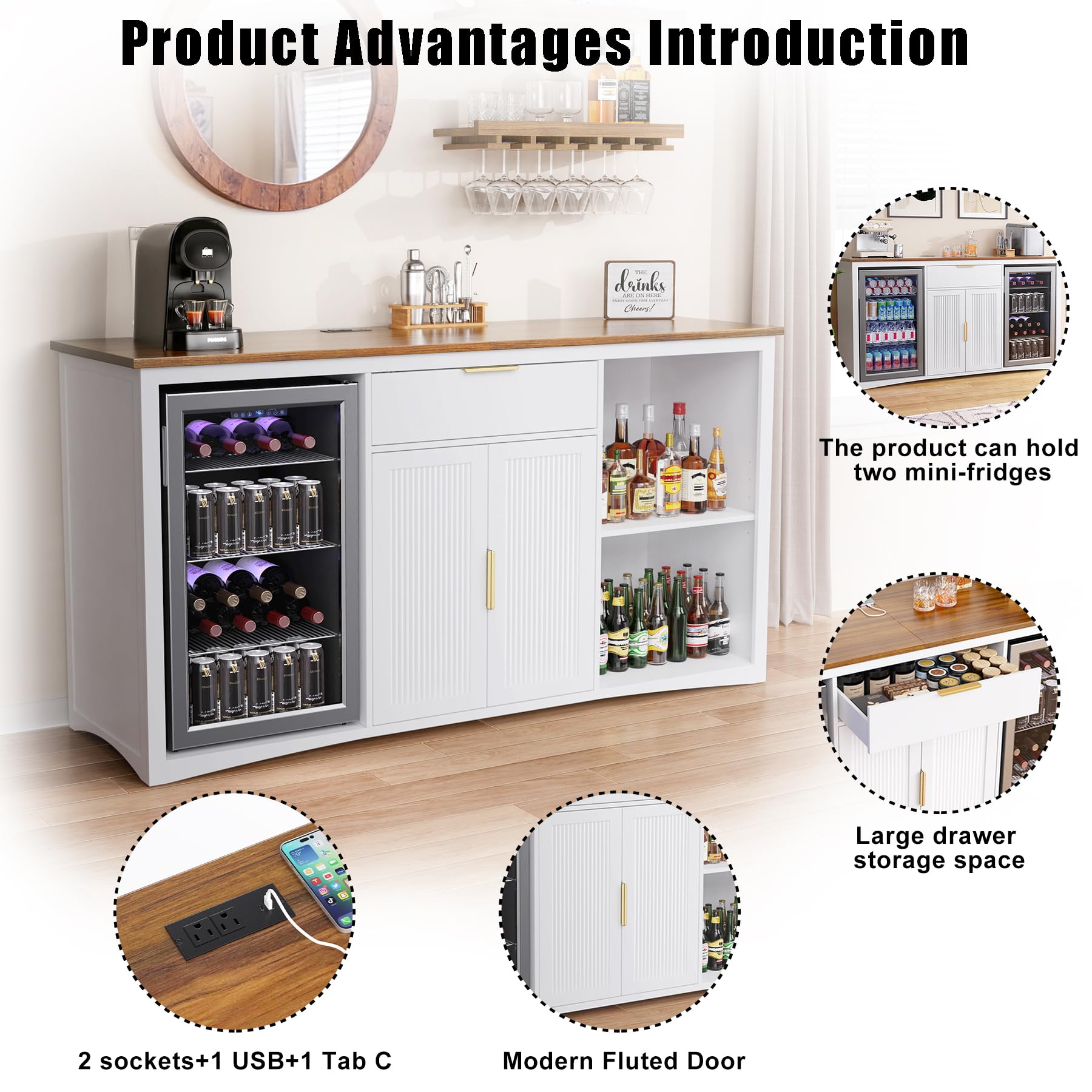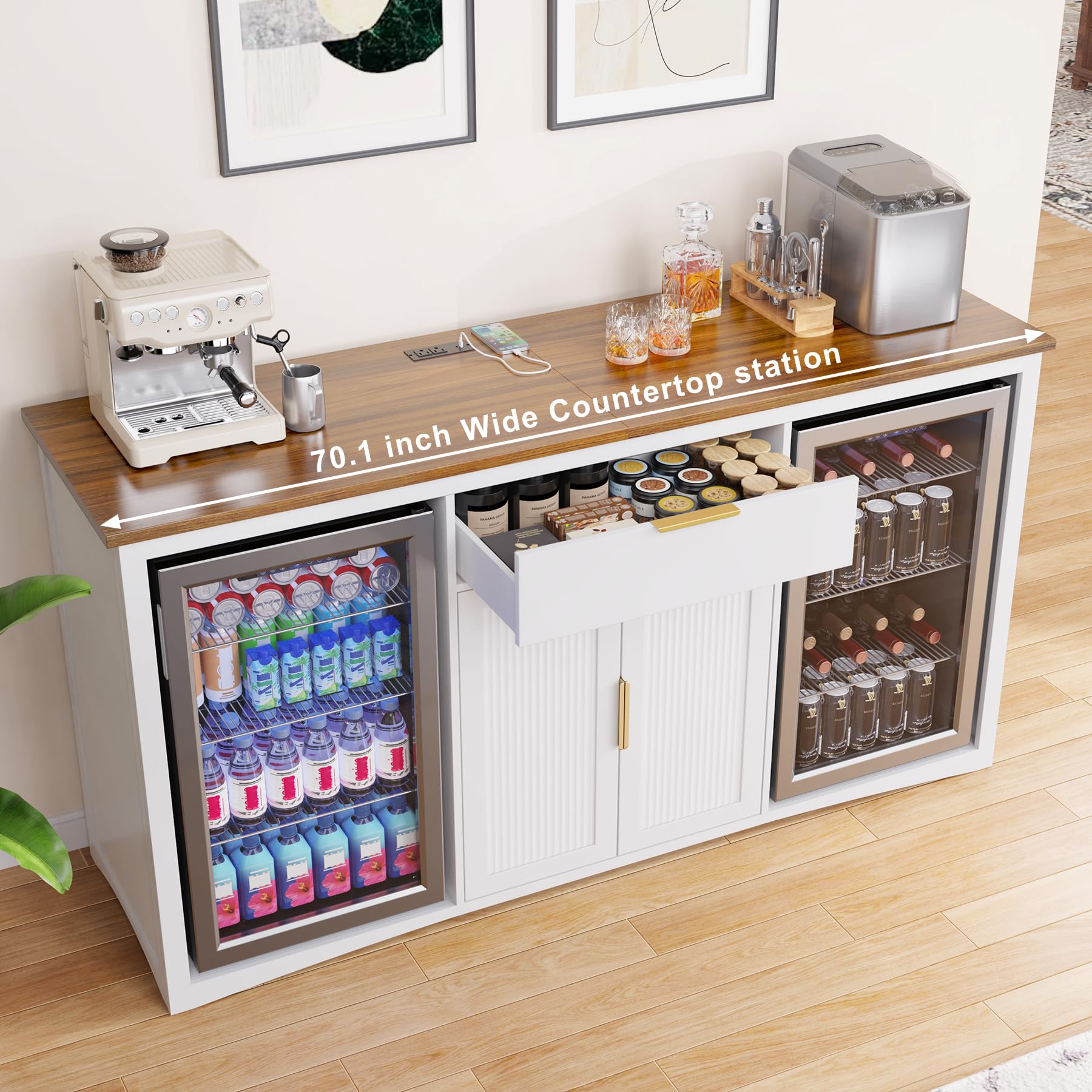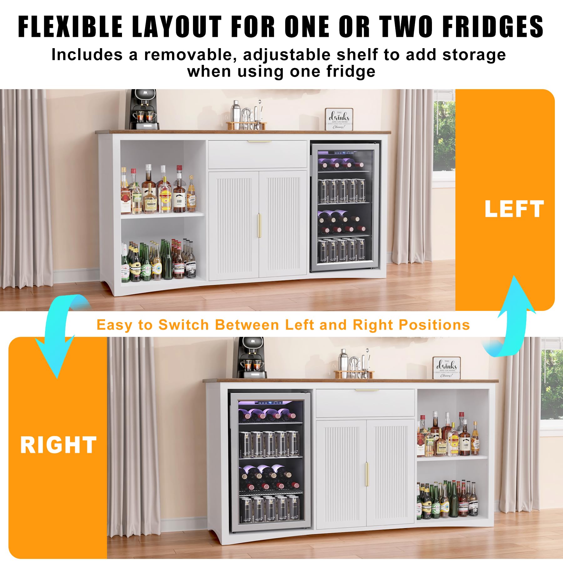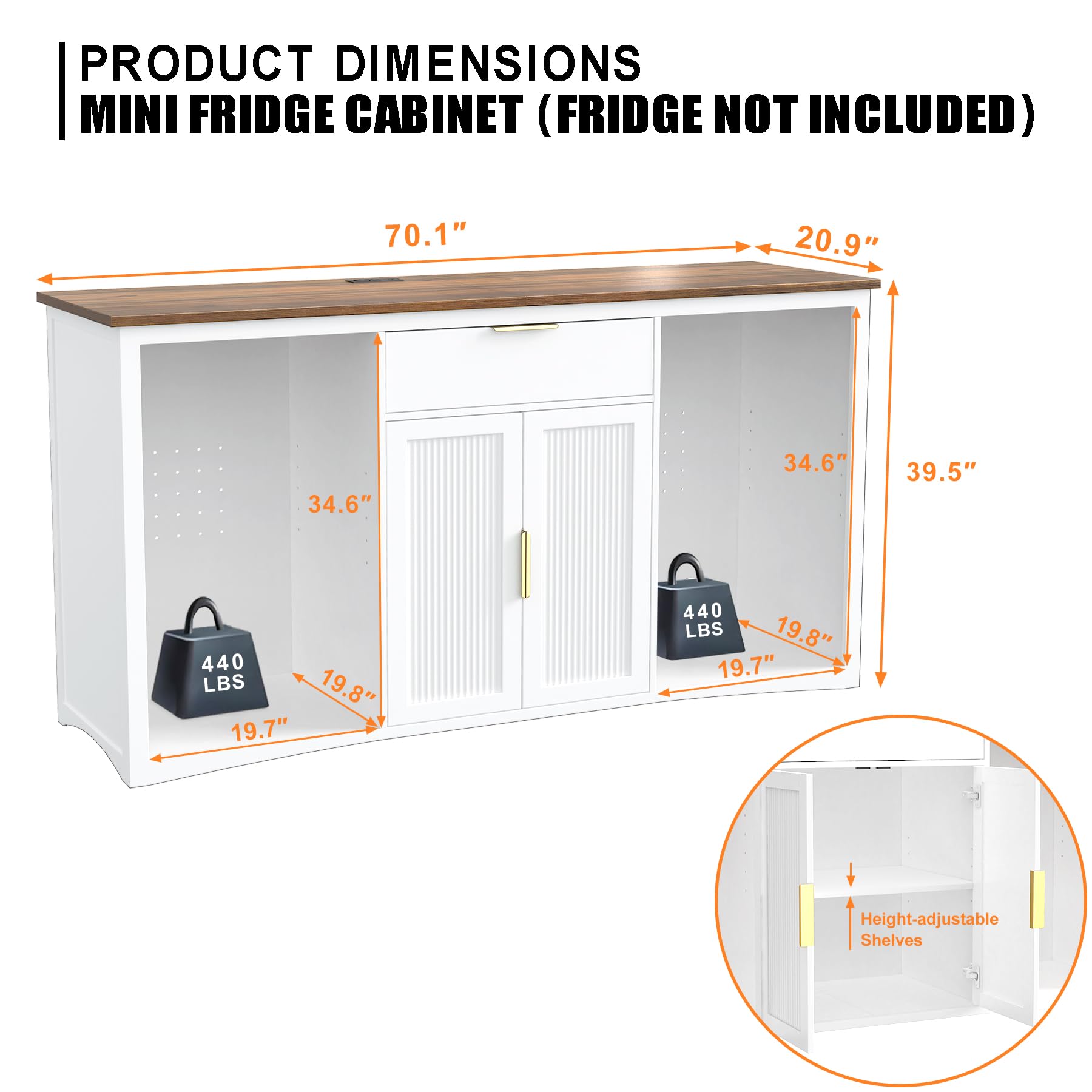 Transform your dining room, living room, or entertainment space with this versatile bar cabinet with fridge space. Designed to accommodate one or two mini fridges, this wide-format cabinet adapts easily to your setup. Whether you're storing beverages, wine, or coffee supplies, the included removable shelf gives you the flexibility to add storage when only one fridge is in use—making it ideal for evolving coffee bar or liquor cabinet configurations. The expansive 70.1" x 20.9" countertop provides ample workspace for drink prep, serving trays, or displaying your favorite décor. A built-in power outlet ensures your appliances—like coffee makers, blenders, or wine coolers—are always plugged in and ready, with no messy cords in sight. It's a thoughtful touch that adds everyday convenience to your coffee bar cabinet or home bar station. Built for both style and storage, the interior includes adjustable shelving, a full-width drawer, and fluted-door cabinets to keep everything from wine bottles to mugs and dinnerware organized. Whether you're hosting guests or enjoying a quiet cup of coffee, this cabinet delivers both form and function. It works equally well as a buffet cabinet, sideboard, or wine cabinet—depending on your needs. The modern design combines a sleek white cabinet body with a warm wood-tone top for an elevated, furniture-style aesthetic. Subtle fluted detailing on the doors adds texture and depth, making this piece a standout addition to any home. It blends seamlessly into a wide range of interior styles, from contemporary to transitional. Please note: this cabinet ships in two boxes, which may arrive separately. We recommend assembling the unit only after both boxes have been delivered.