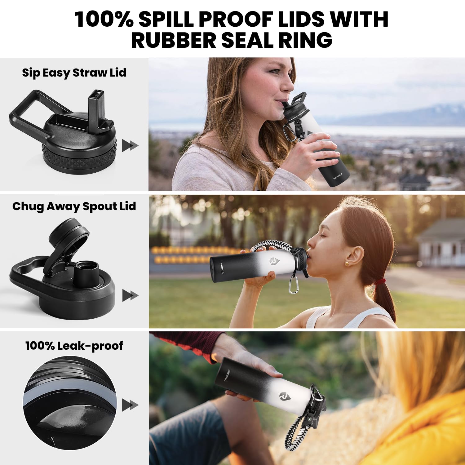 Full Seal Leak-proof Lids: All scenario spout and straw lid with rubber seal ring ensures not a single drop leaks no matter how bumpy your journey gets.Straw lid allows for a quick refreshment without stopping you, while spout lid is great for proper hydration whenever you feel like a boost.Keeps your drinks fresh and spill-resistant on the go