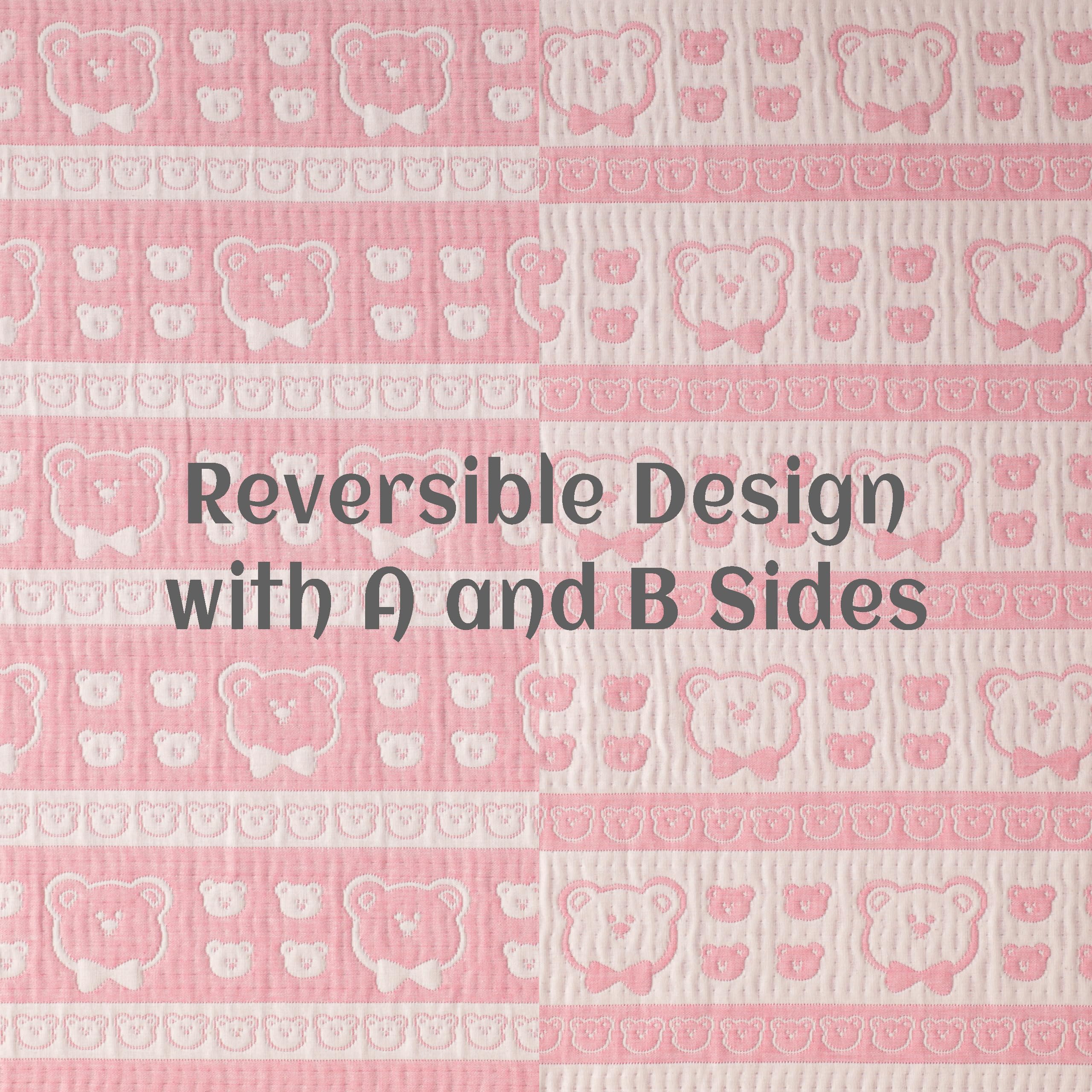Classic reversible design: This blanket is designed reversibly which is very convenient and durable. The front is the pink background dotted with white bear patterns. The back is the white background dotted with pink bear patterns.