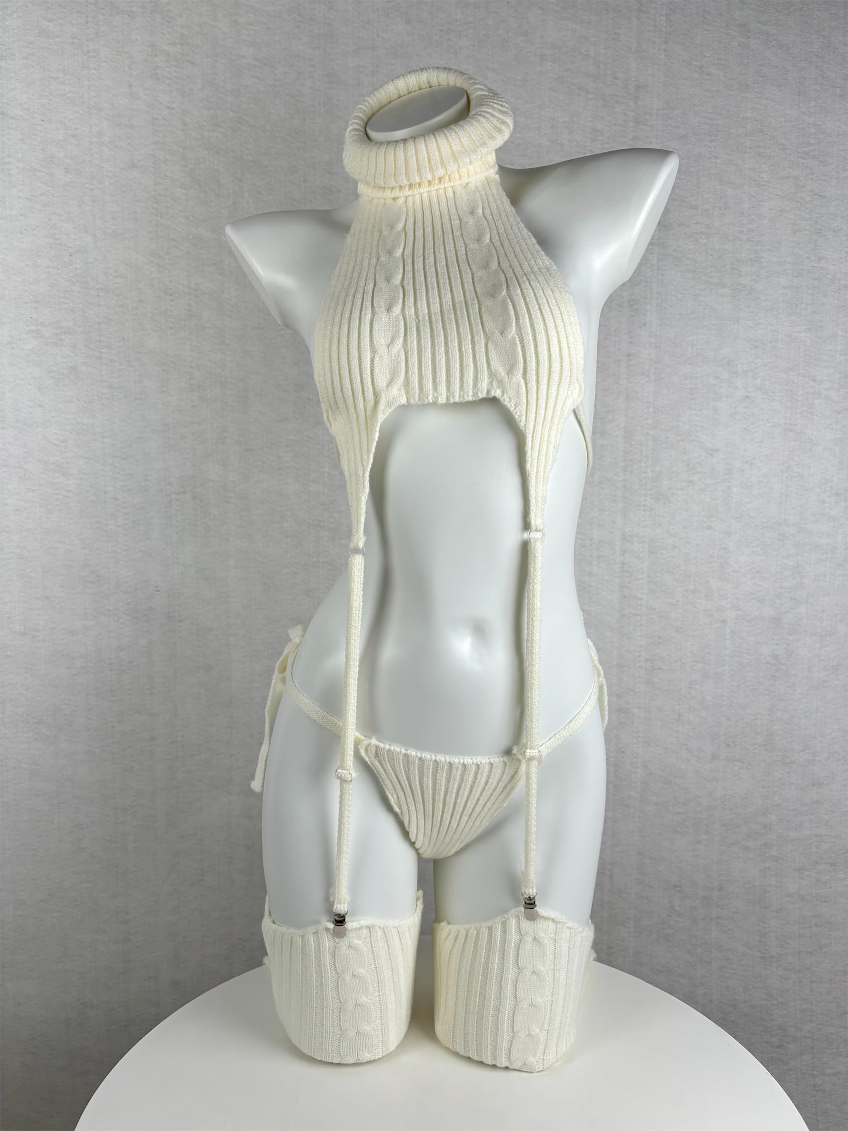 Description This paloli four-piece white knit sweater set is crafted from soft knit fabric and includes a high-neck halter sweater top, tie-up panties, thigh-high stockings, and gloves. The top features a unique garter strap design that not only secures the stockings but also enhances its sensual appeal, perfectly blending warmth and allure. Whether for conventions, cosplay parties, or special occasions, this set will make you the center of attention, showcasing elegance and confidence.