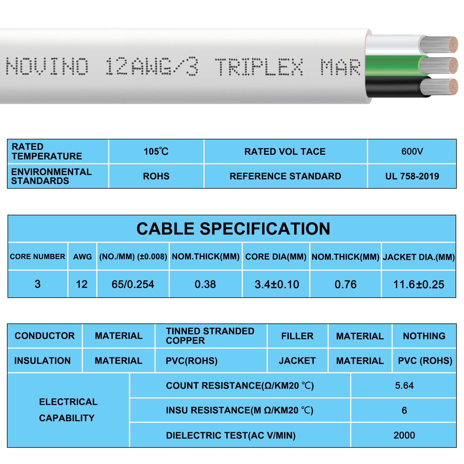 12/3 marine triplex wire Spec:White PVC jacket,3 color(white,green and black) conductor sheaths, tinned & stranded true 12 AWG 12/3 flat tinned copper wire,12 gauge boat wire cable operating voltage rate up to 600v, 105 degrees C dry, and 75 degrees C wet