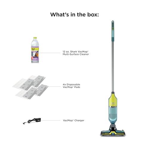 WHAT'S INCLUDED: Shark VACMOP Reveal Cordless Cleaner, Charging Cable, 4 Disposable VACMOP Pads, 12oz VACMOP Pet Multi-surface Cleaning Solution