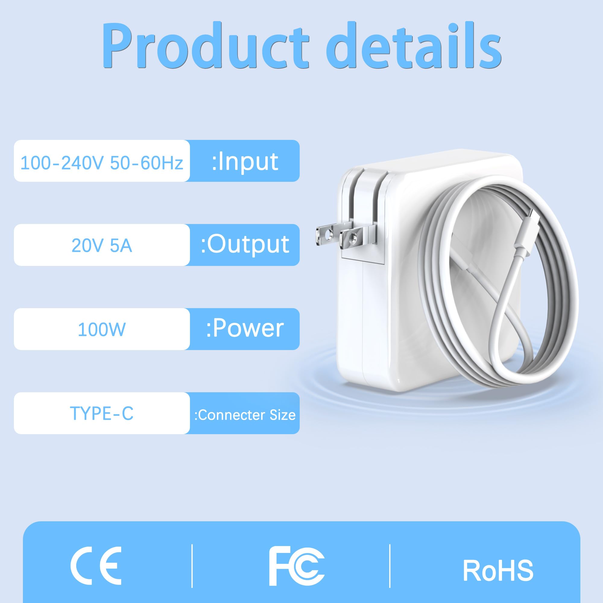 Laptop Charger Specification:Input:100-240V~50-60Hz Output:5V/3A, 9V/3A, 10V/5A, 12V/5A, 15V/5A, 18V/5A, 20V/5A 100W Max. Work with Mac book laptop charger 96W 87W 67W 61W 30W ; What's in package:1 x 100 Watt Charger and 1x 6.5Ft Type-C Cable; 1 x Instruction for USB C Charger
