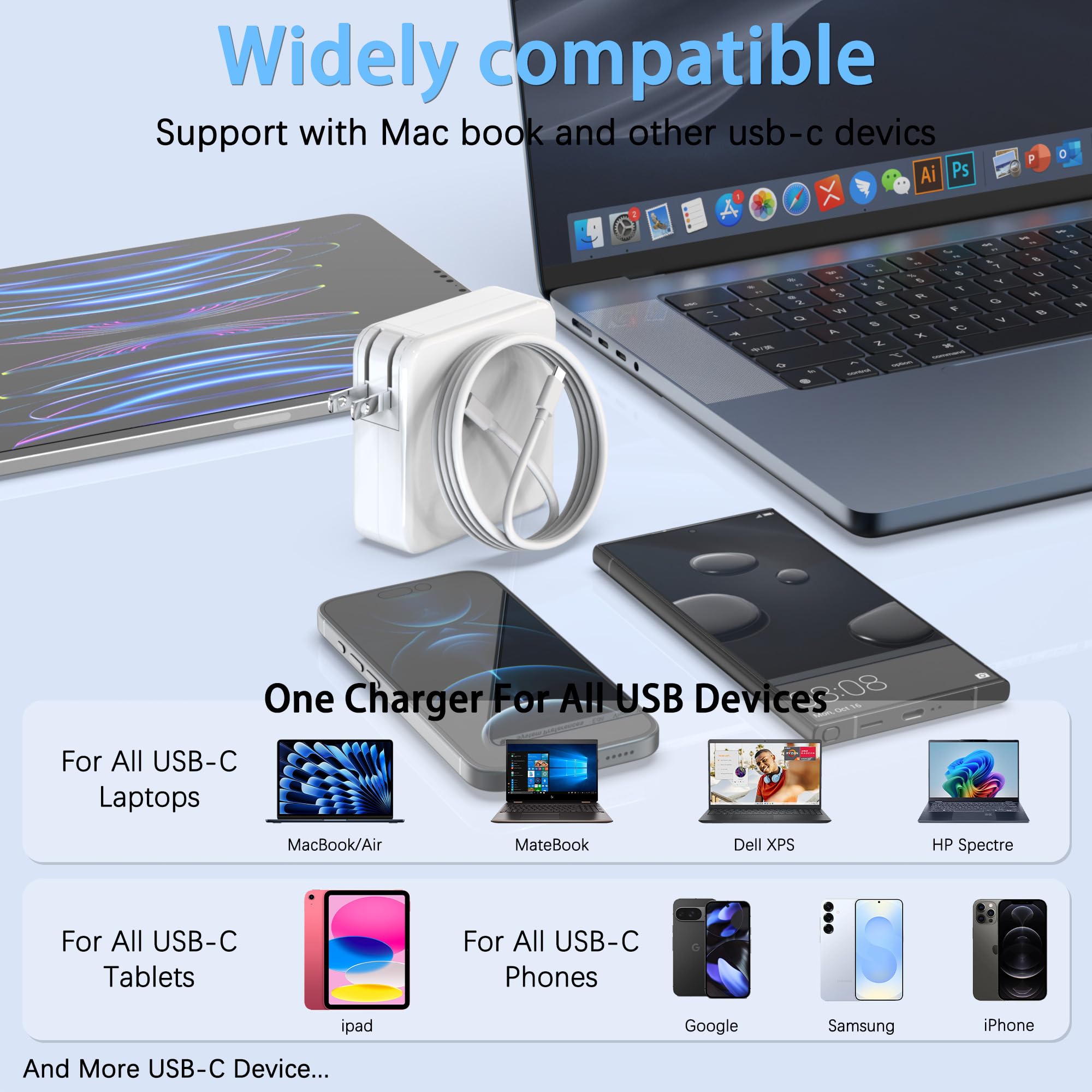 Wide Compatibility:Fit for Mac book pro 13/14/15 inch(2016-2023), Mac book 12 inch(2015, 2016, 2017), Air(2018, 2019, 2020, 2022,2024,2025), you can use this charger instead of 67W/61W/30W/29W adapter for lower wattage. These 87W USB C power adapters also suits for other Type-C phones and new ipad pro, widely used for Type-C supported laptop