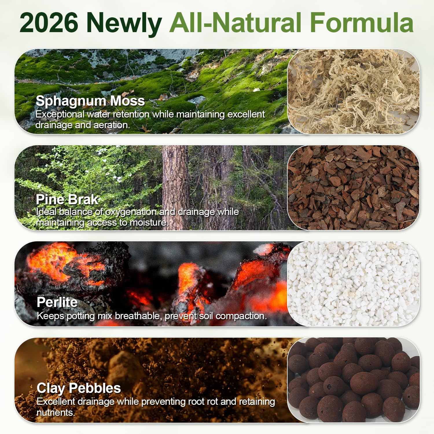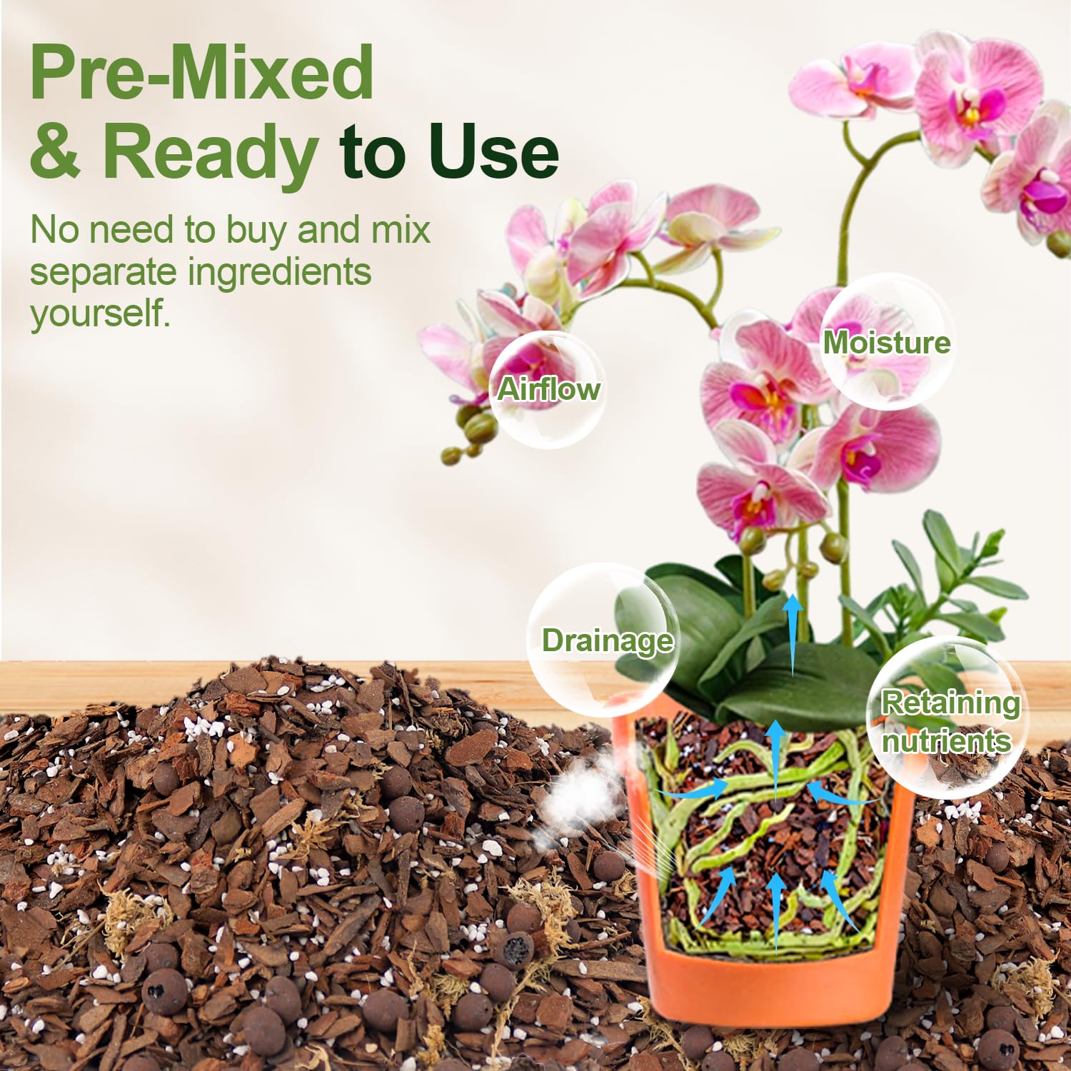 【2026 Newly Formulated for All Orchids Care】Formulated with deep horticultural expertise,this orchid bark mix is a premium indoor potting soil blend four key components–sphagnum moss, orchid bark,perlite,and clay pebbles.Unlike ordinary mixes, this orchid bark potting mix is specially designed for all epiphytic orchids,including Phalaenopsis, Cymbidium,Cattleya, Vanda, and Dendrobium,etc