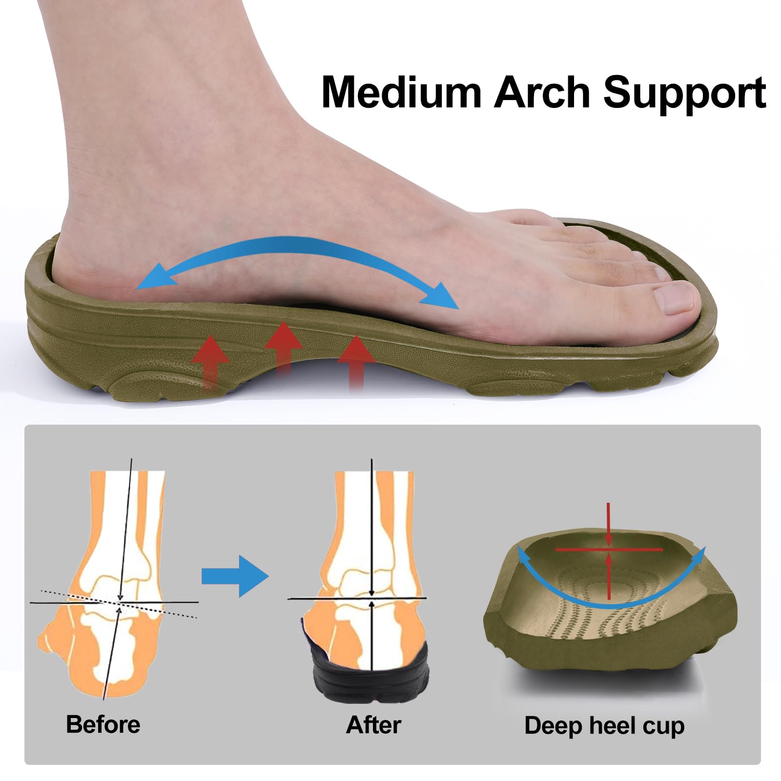 Great Arch Support: Provide medium arch support, relieves foot pain, and increase comfort. The deep heel cup protects your feet from hard surfaces and provides added safety