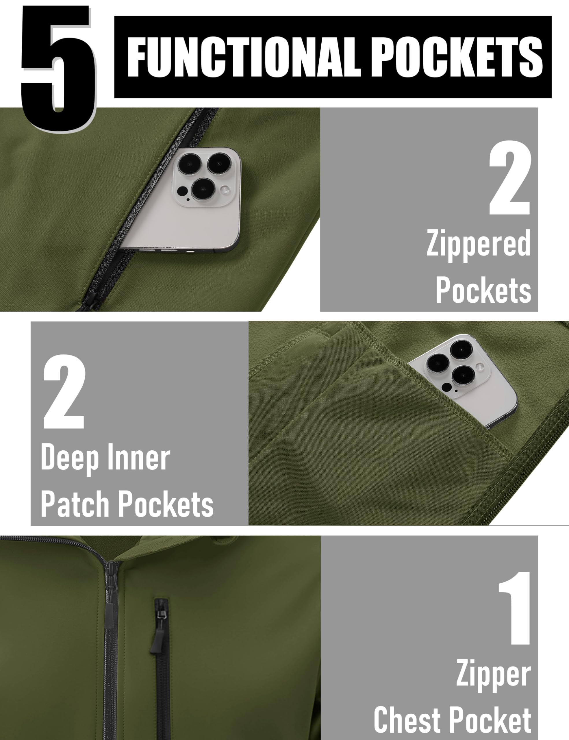5 FUNCTIONAL UTILITY POCKETS - Men's tactical hiking jacket includes 2 inside roomy pockets, 2 zipper hand pockets and 1 zipper chest pocket, providing great convenience for storing money, keys, phone, wallet etc