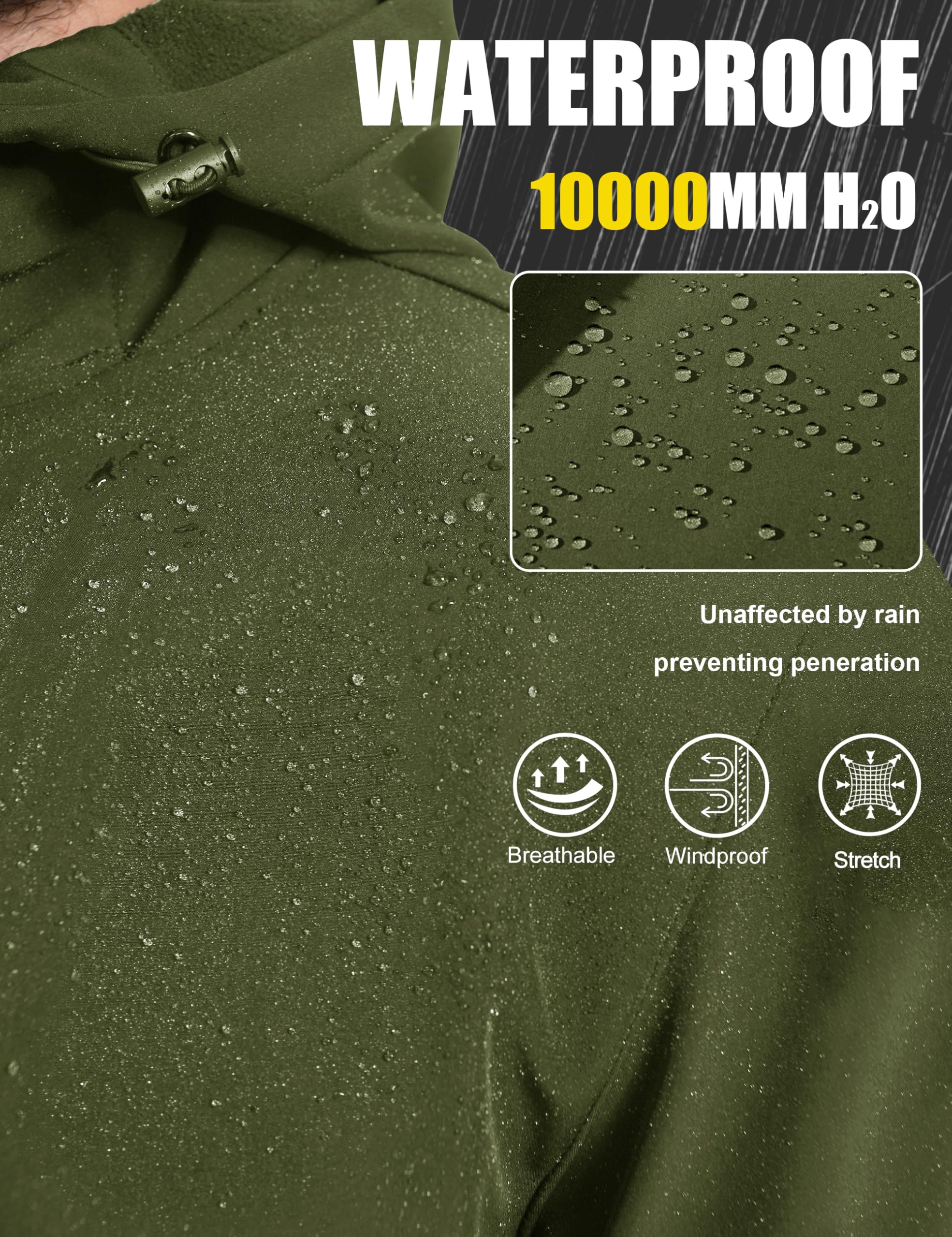 WATERPROOF & BREATHABLE - Men's rain jacket with hood is made of upgraded waterproof and breathable fabric with 10000mm H2O water repellency and 5000g/m2/24Hr breathablility, keeping you dry and comfortable, freeing you of walking in rain and snowflake