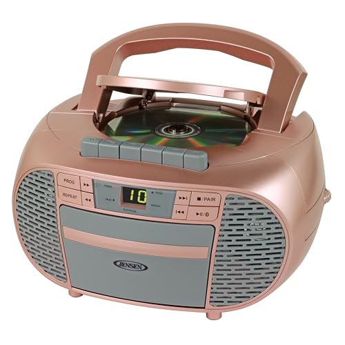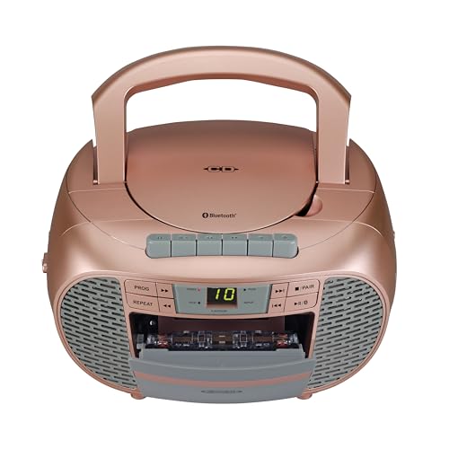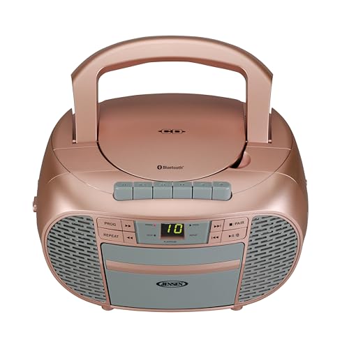 The JENSEN CD-550-RG Portable Stereo Bluetooth Compact Disc Cassette Recorder is the perfect all-in-one music solution for any space. Designed for versatility and convenience, this Jensen Radio lets you enjoy your favorite CDs, cassettes, or AM/FM stations anywhere. With Bluetooth functionality, it transforms into a Bluetooth enabled Radio player that can wirelessly stream your digital music. The unit’s top-loading CD player supports CD-R and CD-RW formats, while the built-in cassette recorder enables one-touch recording. Its green LED track display and stereo speakers enhance your listening experience with clarity and ease of use. Engineered with portability in mind, this portable stereo features a sturdy, smooth-carry handle for travel, dorms, or workspaces. The Compact Disc Radio also includes a stereo headphone jack and auxiliary input jack for connecting MP3 players, iPods, and more. Whether you’re tuning into your favorite AM/FM radio station or enjoying custom playlists via Bluetooth, the JENSEN CD-550-RG Radio Player combines retro utility with modern compatibility in a sleek rose gold finish. Operates via standard AC power or six C batteries (not included) for true portability.