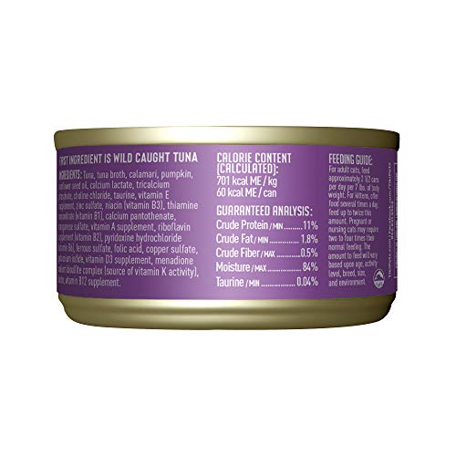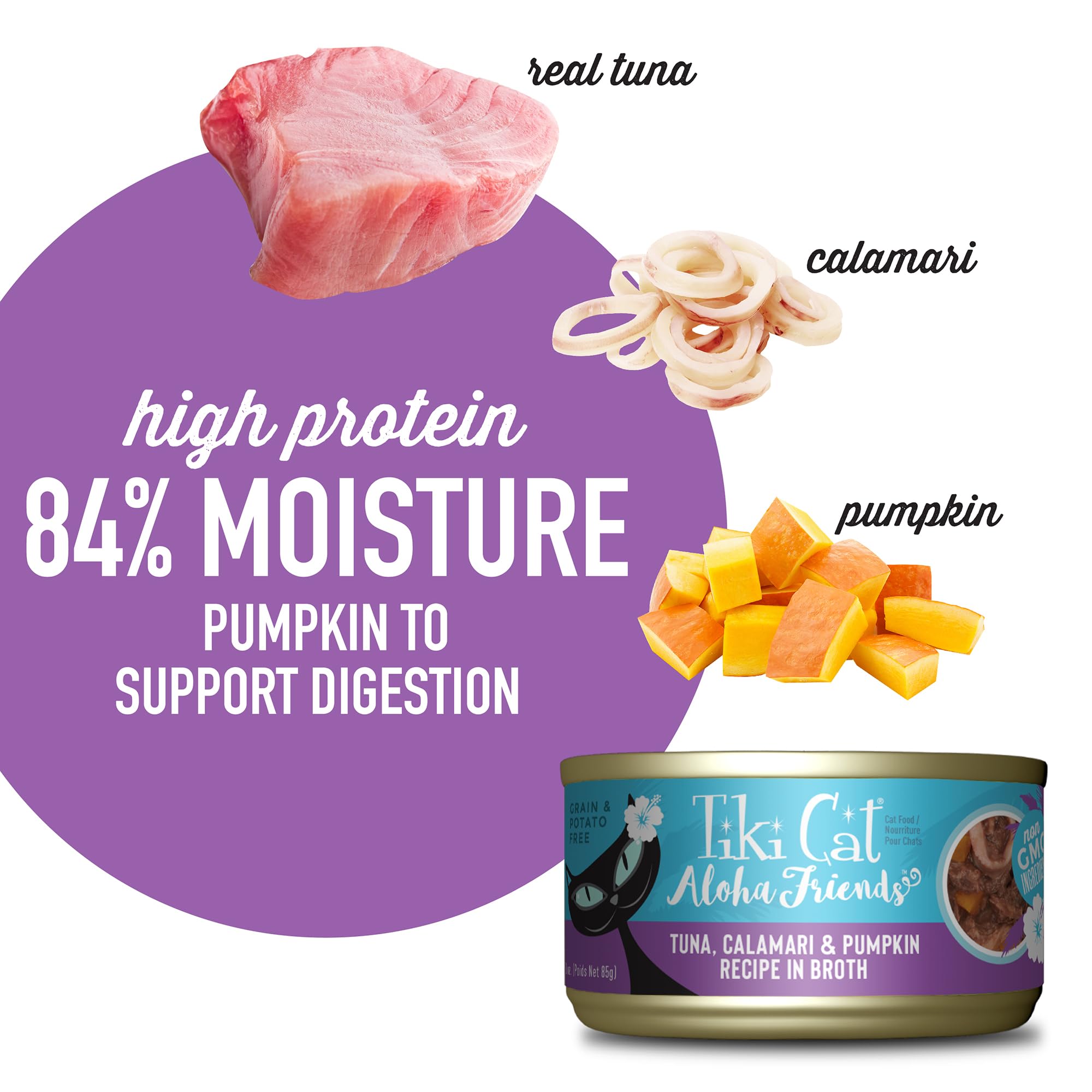 Feed your cat delicious, high-protein meals with real fish, real meat and natural ingredients with Tiki Cat Aloha Friends cat food. With a variety of delicious flavors, you can be sure your cat will love meal time and look forward to savoring each bite of low carb cat food. Each can or pouch of Aloha Friends low carb cat food boasts complete and balanced nutrition of all of your cat's life stages. The high moisture gives your cat the supplemental water she needs while pumpkin provides a gentle source of fiber. This protein rich cat food is grain free and features real tuna as the first ingredient. Plus, you and your cat will both enjoy these benefits in every can of our nutrient rich cat food: No by-products or fillers Grain-free and low or no carbohydrates Real, natural ingredients to promote healthy skin, coat, digestion and more Great taste for finicky felines Balanced meal and ideal nutrition for all life stages See the difference that Tiki Cat makes, and give your cat the nutrition she needs and the flavor she craves. Guaranteed Analysis 53 kcal/can Crude Protein (min) 11.0% Crude Fat (min) 1.8% Crude Fiber (max) 0.5% Moisture (max) 84.0% Ash (min) DM 1.5% Feeding Guidelines Recommendations vary greatly, based on your cat's age, activity level and life stage. For adult cats, feed approximately 2-3 cans/pouches per day per 7 lbs. of body weight. For kittens, offer food several times a day, feed up to twice this amount. Pregnant or nursing cats may require two to four times their normal feeding. The amount to feed will vary based upon age, activity level, breed, size, and environment. Please use the feeding guidelines as an initial recommendation and adjust food amount as needed to maintain proper weight. Always provide access to clean, fresh water. Canned food should be changed at least twice daily in order to prevent spoilage. Serve at room temperature, and refrigerate any unused portion. Ingredients Flaked tuna, tuna broth, pumpkin, calamari, sunflower seed oil, calcium lactate, tricalcium phosphate, choline chloride, taurine, vitamin E supplement, zinc sulfate, thiamine mononitrate vitamin B1), niacin (vitamin B3), calcium pantothenate, manganese sulfate, vitamin A supplement, potassium iodide, ferrous sulfate, riboflavin supplement (vitamin B2), pyridoxine hydrochloride (vitamin B6), copper sulfate, folic acid, vitamin B12 supplement. AAFCO Certified Tiki Cat Aloha Friends cat food is formulated to meet the nutritional levels established by the American Association of Feed Control Officials (AAFCO) cat food nutrient profiles for all life stages. Purposeful Ingredients: Tiki Pets foods use carefully selected, real ingredients. Nothing artificial. Nothing you can’t pronounce. Protein First: High-quality meat, poultry or fish is always the #1 ingredient, with more protein than most pet foods. The Tiki Cat philosophy is simple, feed your cat the way she was born to be fed. Cats are born obligate carnivores and need a high protein, high fat, meat-based diet to thrive. In the wild, cats hunted their prey, which were typically 50%-60% protein. Plants were consumed in minimal amounts. Though domesticated much earlier, cats only began to eat commercial pet foods in the last 60 years. Their dietary needs have not changed an like their ancestors, they still need a primarily meat diet for optimal digestibility and key nutrients. See the difference that Tiki Cat makes, and give your cat the nutrition she needs and the flavor she craves. Try Tiki Cat Food today