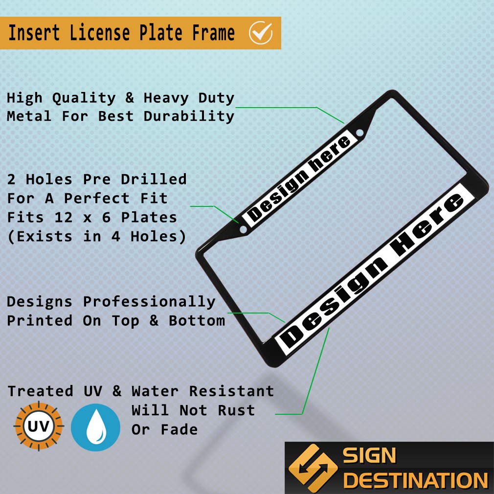 Custom Insert License Plate Frame Funny Weatherproof Treat yourself to exciting new car accessories that will catch everyone's eyes. Decorate your vehicle and make it look unique and funny with our insert metal license plate frame. Very clear, bold, easy to read lettering can be read from a distance by other drivers. Our designs are professionally printed on our personalized license plate frame with state-of-the-art equipment guaranteed to last for years. We have more than 12 years of experience in the printing industry to offer you stunning detail and rich lifelike colors. All prints are carefully made in our lab in Tampa, Florida. CUTE CAR ACCESSORY! ** Made from high quality metal ** Fits every cars' license plates in the U.S. and Canada ** 2 holes Pre-drilled for any easy installation ** Weatherproof! Treated against UV & water ** Design professionally printed all over the license plate frame GREAT GIFT IDEA: Unforgettable, our frames are the perfect gift for new drivers, new car owners, birthday gifts, anniversaries, graduations, housewarming, bachelor party, Christmas, Father's Day, Mother's Day or any other celebrations. Perfect for someone who is looking for funny license plate frame, cute license plate holder, humor black license plate frame, car tag frame, license plate frame for women license plate frame for men.