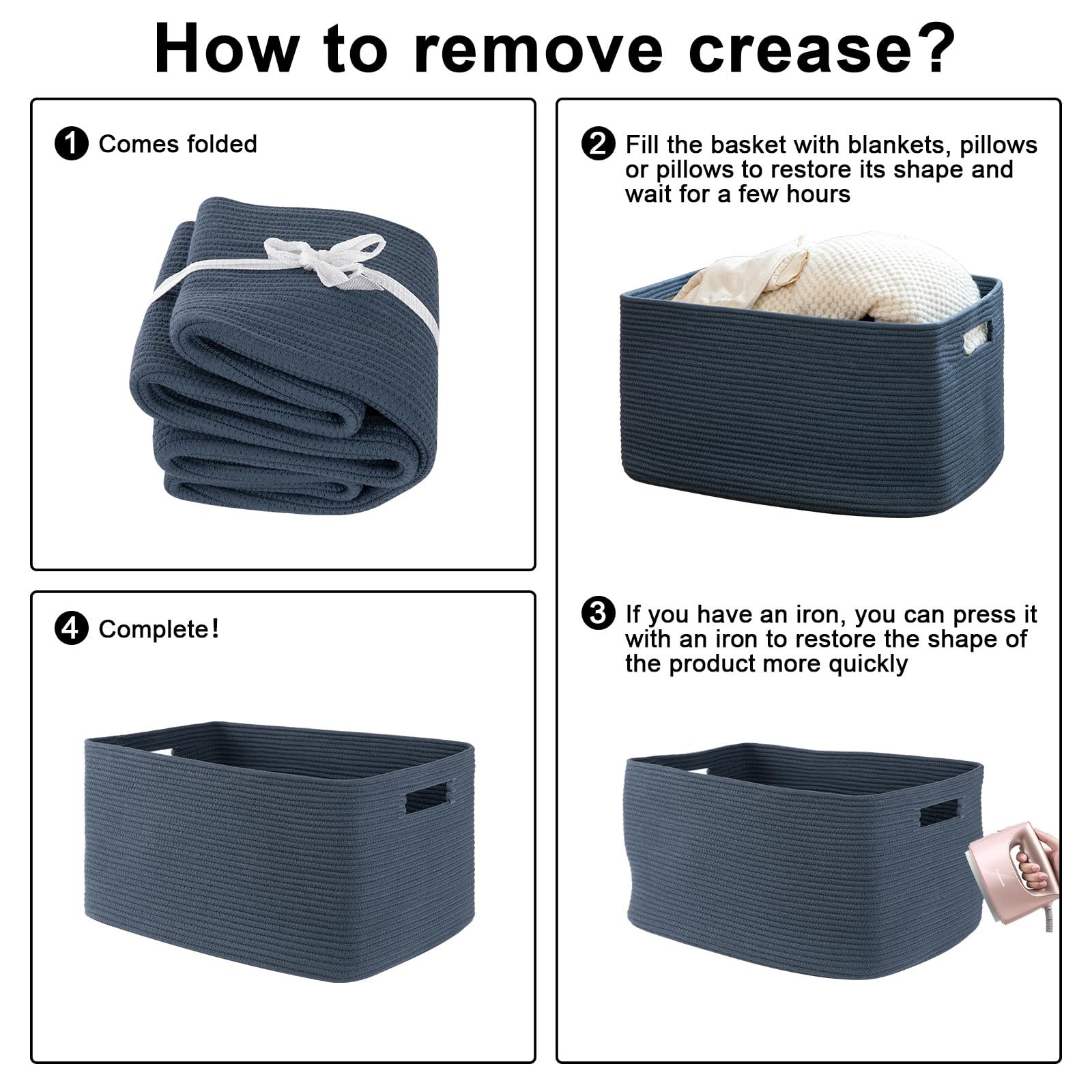 NOTE: The toy basket is folded, but it will turn back to its elegant shape quickly if you fill it with some pillows or blankets, and iron is great idea to remove the creases