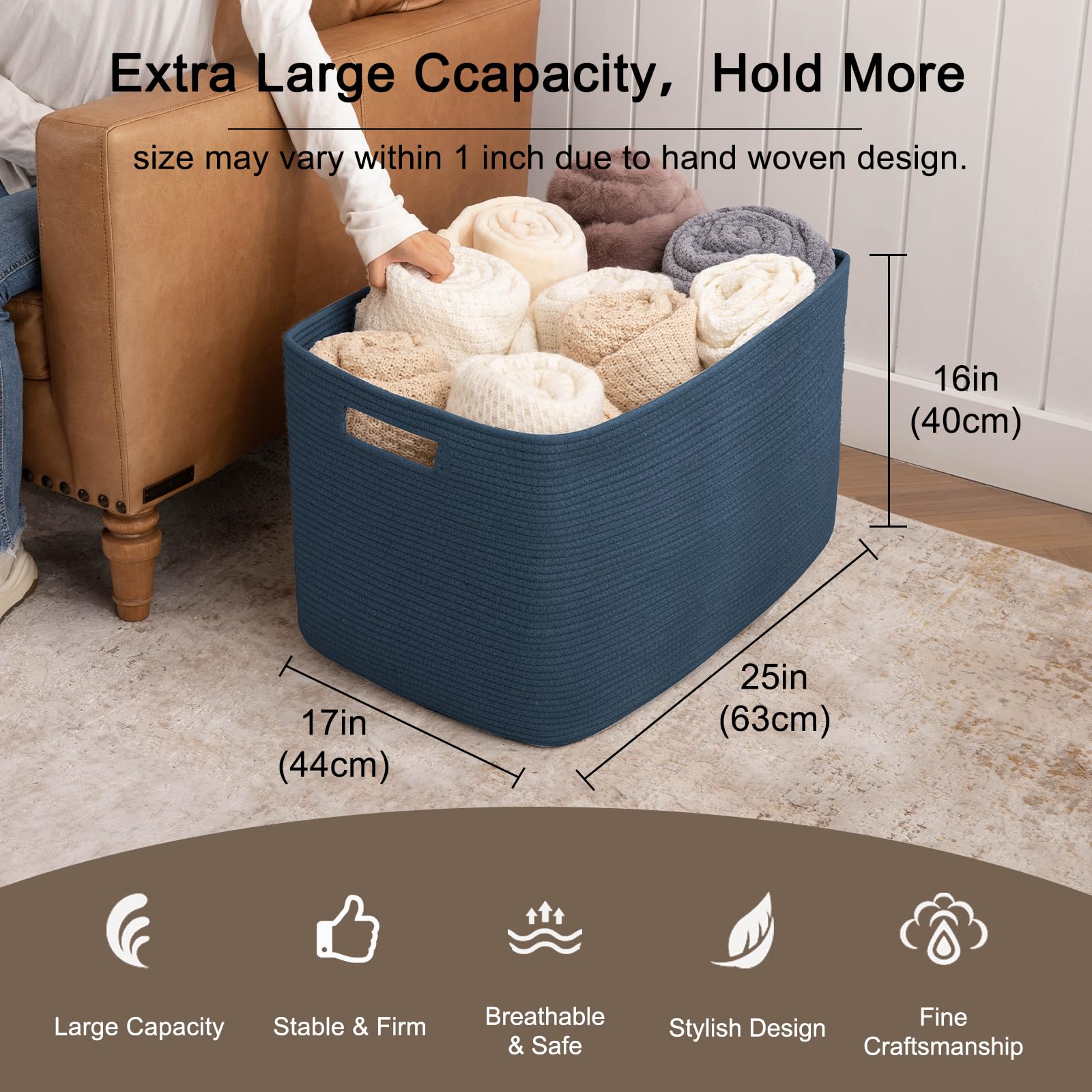 OIAHOMY 118L XXXLarge Cotton Rope Storage Basket, Oversized Blanket Basket, Used for Organizing Dirty Clothes in Living Room, Bedroom, Nursery, Dog Toy Storage Bins, 25" x 17" x 16",Blue
