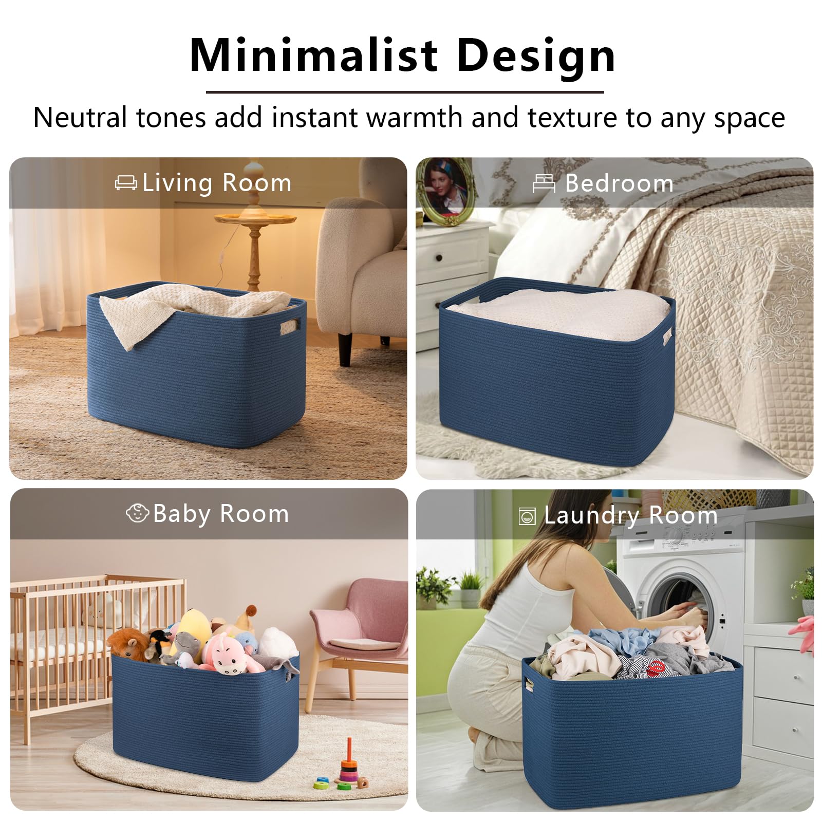 Double reinforced Handles:We use the highest grade cotton rope as raw material and all the stitches are distribution and fine,which makes the baskets better wear resistance and durability to be used for many years.In addition, the handle of this large basket has a unique design and is wrapped around with thick double-layer suture rope to prevent tearing and keep its shape and never fall off