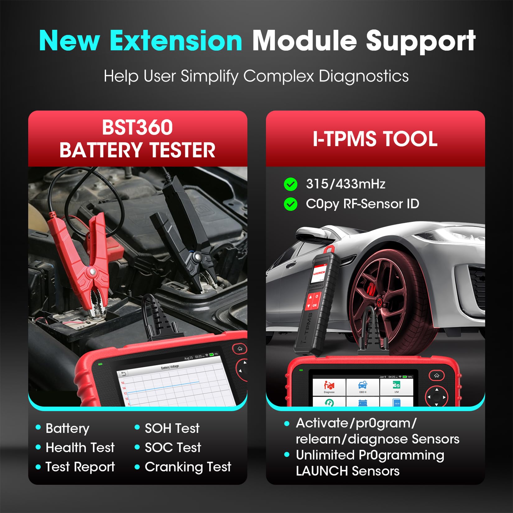 [Expansion Modules] The LAUNCH CRP123X V3.0 can pair with many expansion modules to expand your service capabilities:1) Battery Tester (BST360): Test 12V batteries to get an expert assessment of state of charge (SOC), state of health (SOH), and health status. Perform in-vehicle or out-of-vehicle tests with 98% accuracy.2) LAUNCH X431 i-TPMS Tool: Perform all TPMS functions, including activate, relearn, and pr0.gram sensors; pull tire pressure, temperature, and IDs; and reset TPMS. (Optional-Additional purchase required)