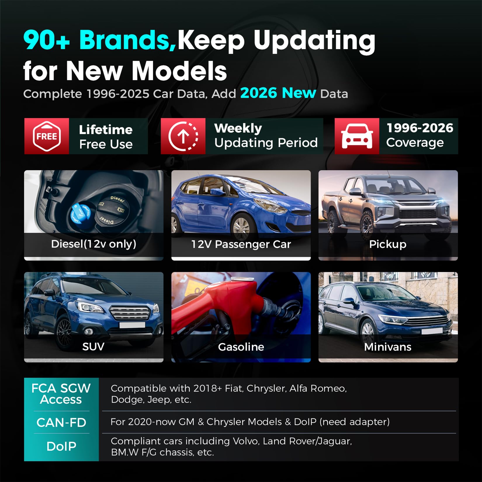 🔥[No extra software fee. Works on 90 vehicle brands.] Most OBD2 scanners work with vehicles manufactured after 2001. However, the LUNCH OBD2 scanner is compatible with OBDII-equipped vehicles built after 1996 and works with more than 90 vehicle brands. One-click lifetime updates over WIFI 2.4&5.0Ghz keep the car software current and ensure constant coverage additions, diagnose vehicles from 1996 to 2026 with a massive global database. Android 8.1 ensures lightning-fast boot-up and processing.
