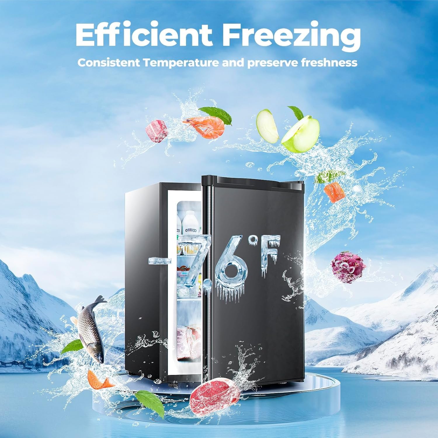 🧊ALL-ROUND FAST COOLING:2.1 Cu.ft high capacity upright freezer with powerful refrigeration. Faster and more thorough freezing, ten minutes of extremely fast freezing, to ensure the freshness of the ingredients. Compact Freezer is saving space design.Large Capacity is Great using for breast milk, meat, ice cream, aquatic products, cold drinks, quick-freezing and other purposes.Perfect for Home,Dorms,Kitchen and Office.