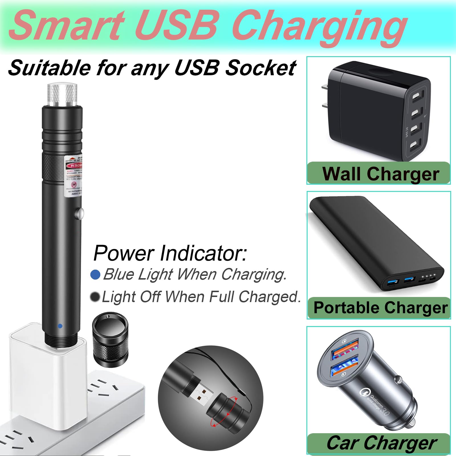 🎊【USB Rechargeable Laser Pointer】: This laser pointer can be charge through the built-in USB port, Just unscrew the back cover of the laser pointer and plug into usb device! No need to buy batteries and USB cable
