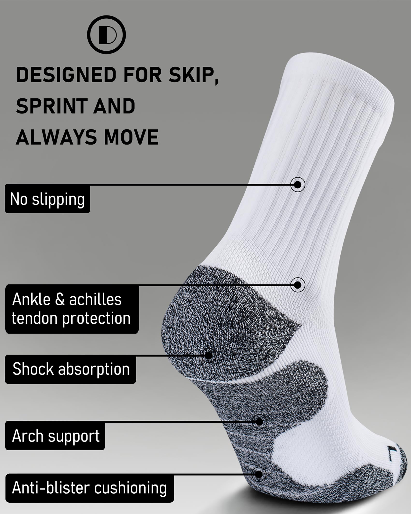Targeted cushioning and compression, shock absorption, anti blister, arch support, ankle and achilles tendon protection