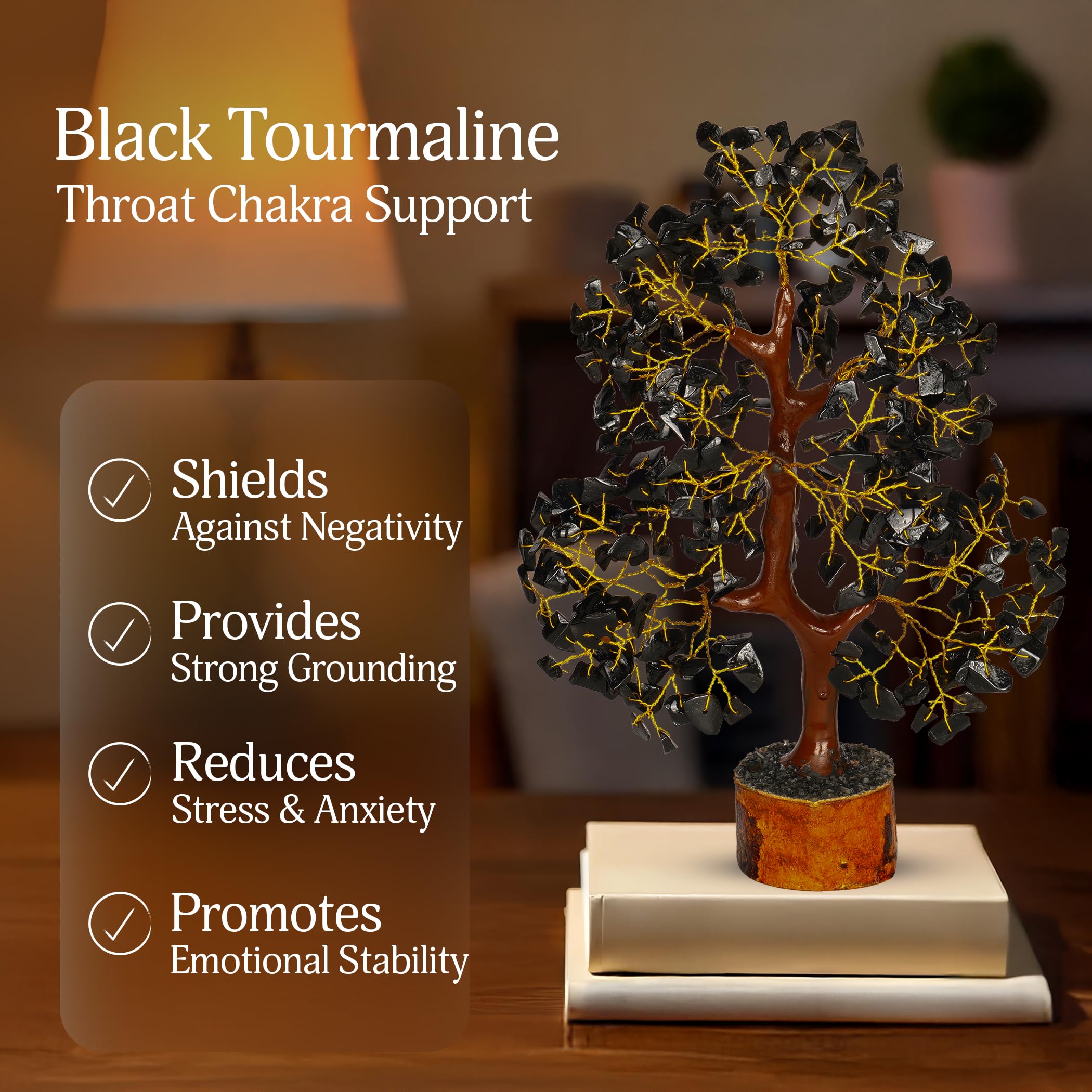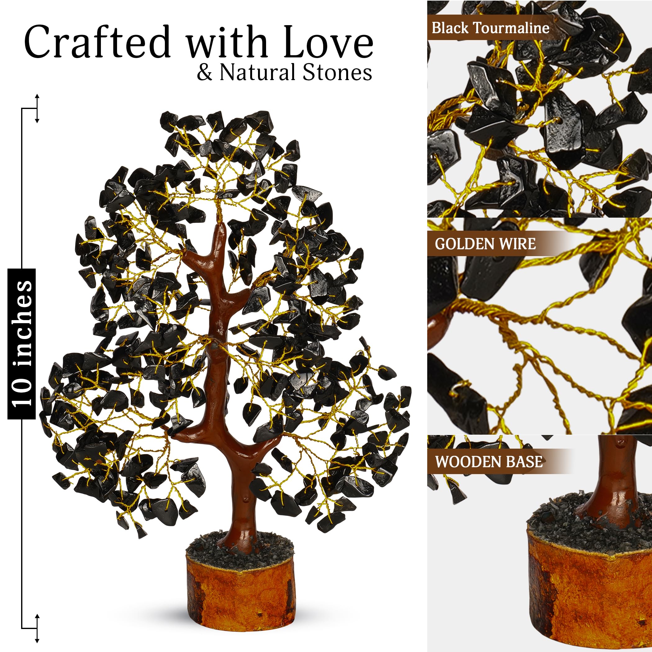 Specification - A wire bonsai tree handmade in india, beaded with natural black tourmaline crystals. The base of this feng shui figurine is made of wood, which keeps the proper balance of this chakra tree. The middle portion (trunk) is made with strong mseal, and the branches are made of golden wires. You can expand the branches as the wires are foldable. These natural black tourmaline crystals are embedded in the wire branches. The total size of this crystal tree is approximately 10-12 inch.