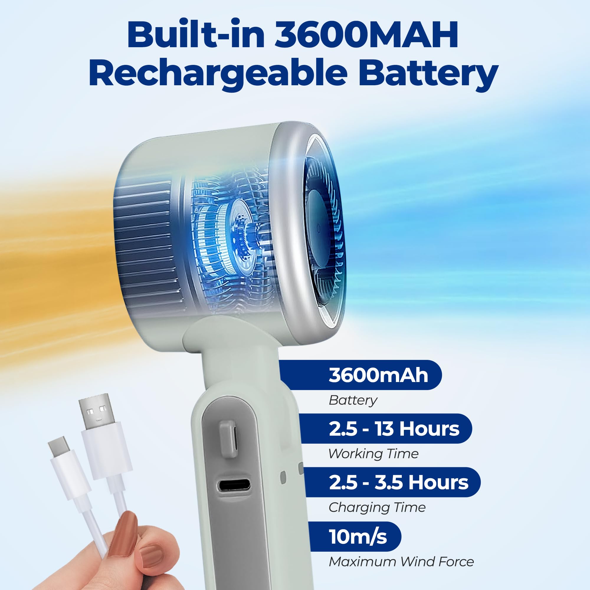 Rechargeable & Long-Lasting – 3600mAh Battery Stay cool for hours with the built-in 3600mAh battery, offering up to 12 hours of use. USB-C rechargeable and compatible with laptops, power banks, and car chargers for easy recharging on the go.