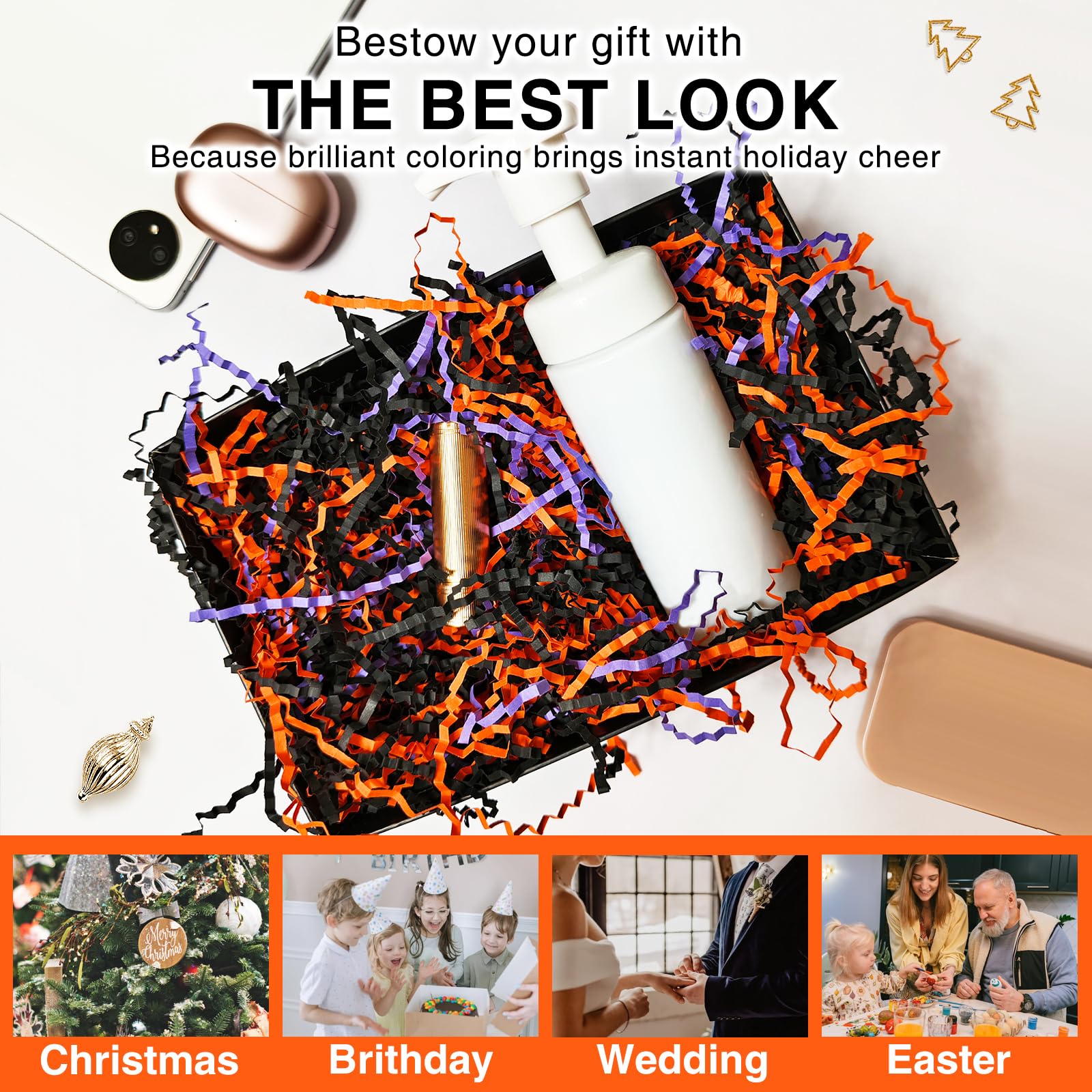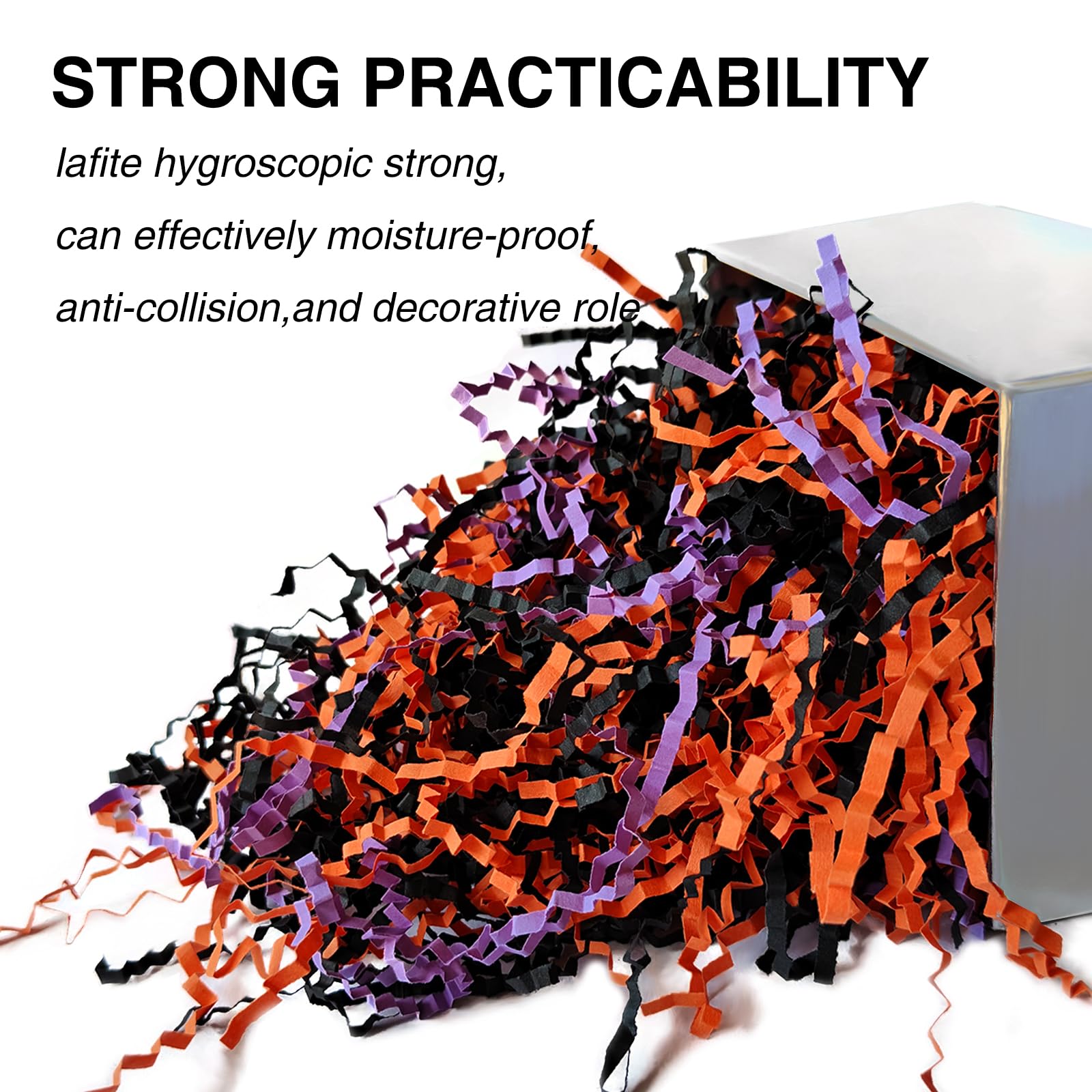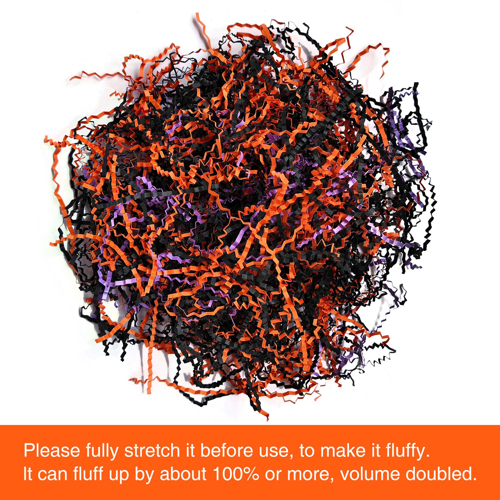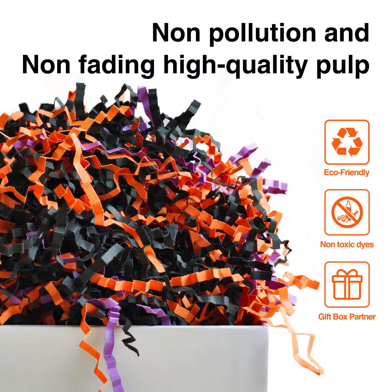 Crinkle Cut Paper Shred Filler Brand:Corlcol Color:Orange&Black&Purple Weight:7oz Package Includes: shred Paper Uses:Gift Box and Basket Filler If you have any questions or concerns, please feel free to contact us, and we will do our best to solve the problem.
