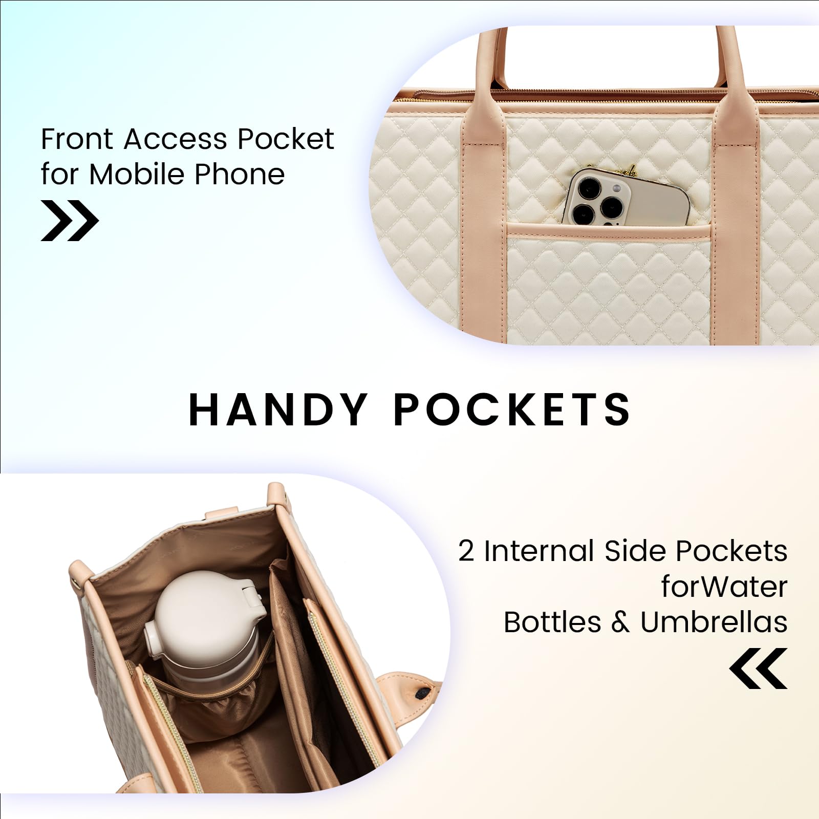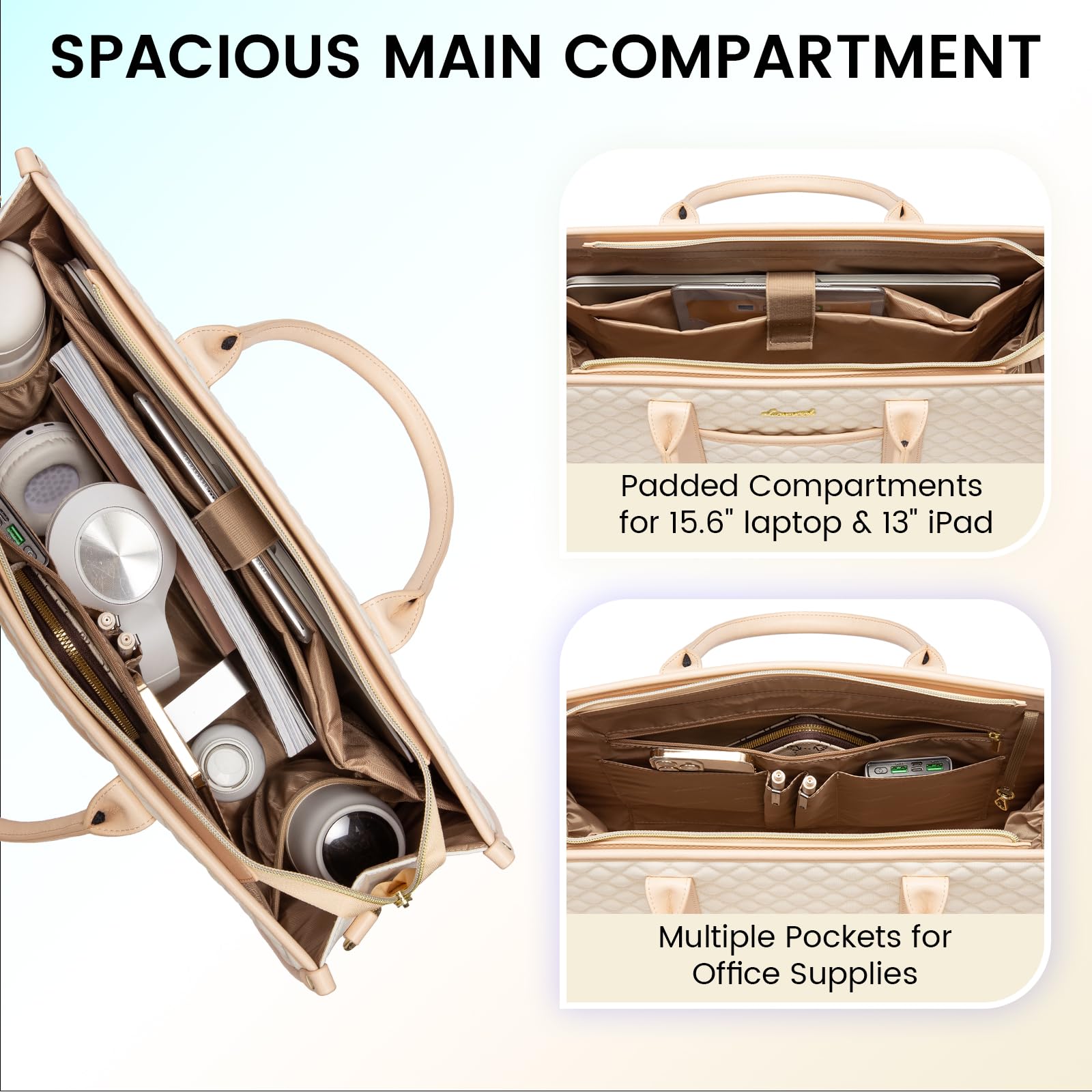 Superior Storage & Smart Organization: This elegantly designed laptop bag for women (Size: 15.6" x 12" x 6") offers ample space for all essentials. Its compartments are tailor-made for A4 documents, folders, a 15.6" laptop, and a 13-inch tablet, each protected by sturdy padding. The laptop tote bag's smart internal layout, including a keychain holder and specialized pockets for water bottles and umbrellas, ensures that every item has its place.