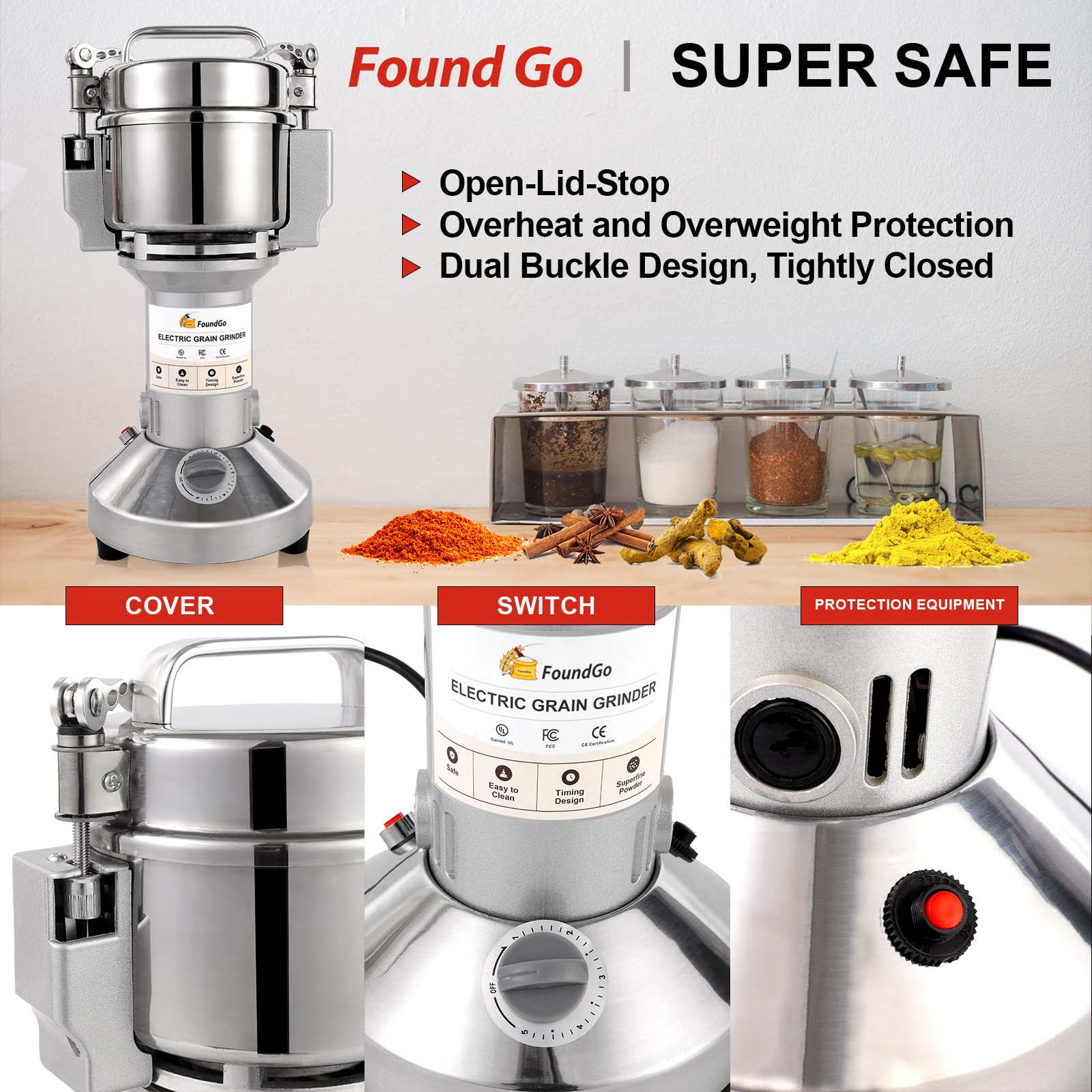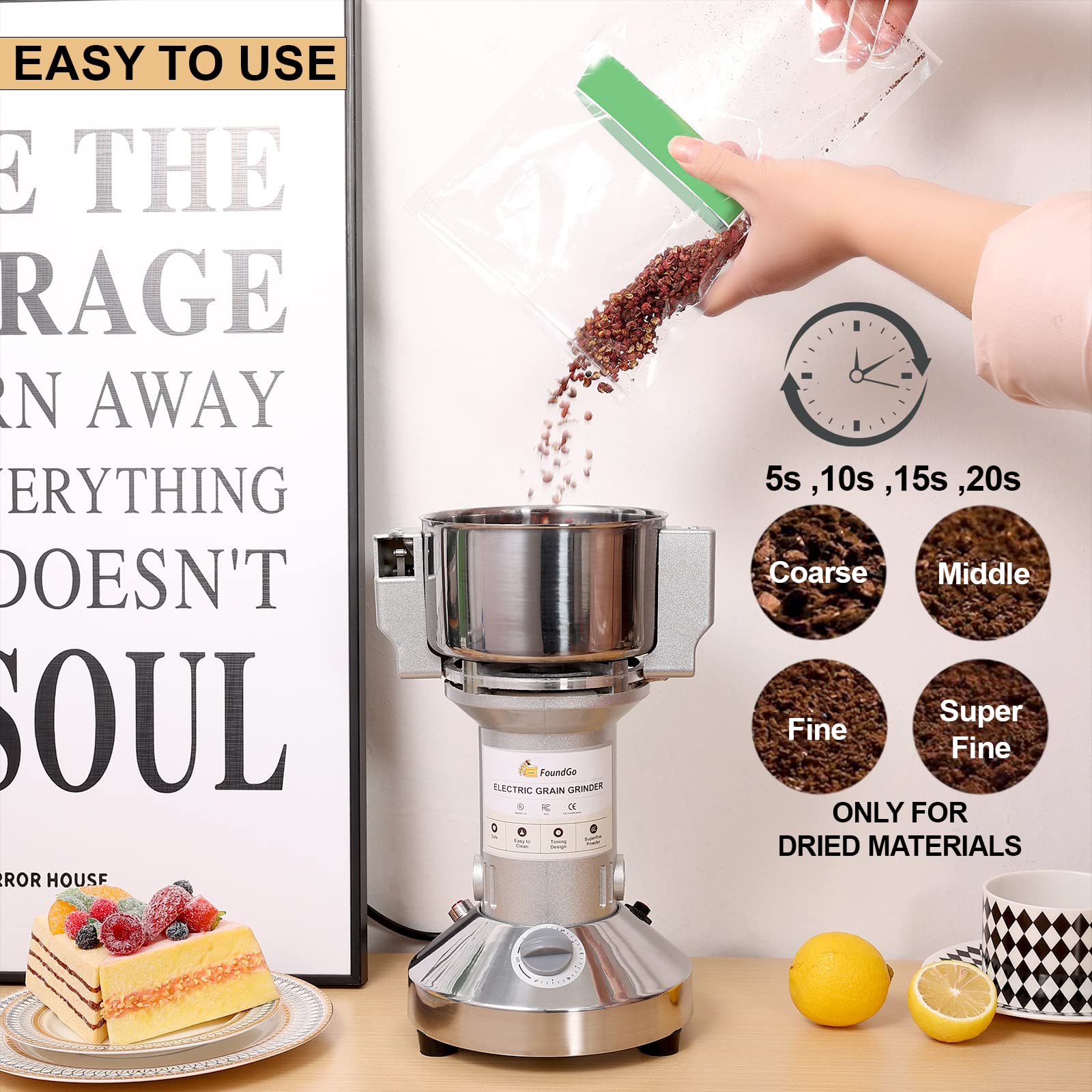 [Superfine Powder]: Power: 2,400W; Capacity: 10.6oz/300g; Speed: 25,000rpm; Working time: no more than 5 minutes. FoundGo grain mill is specialized in grounding dried material into 60 to 300 mesh superfine powder within one minutes, while some extremely hard materials need to takes 2-3min.