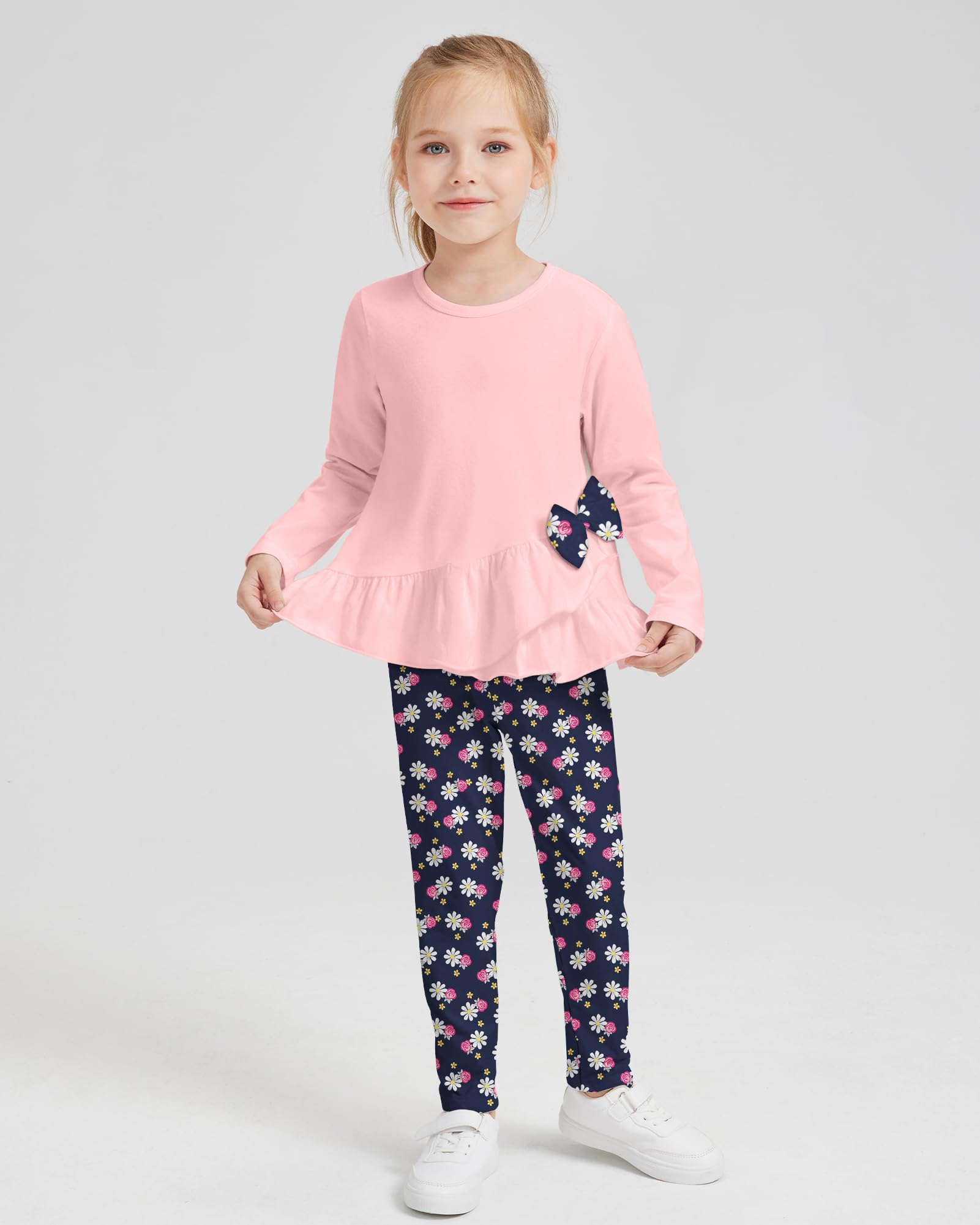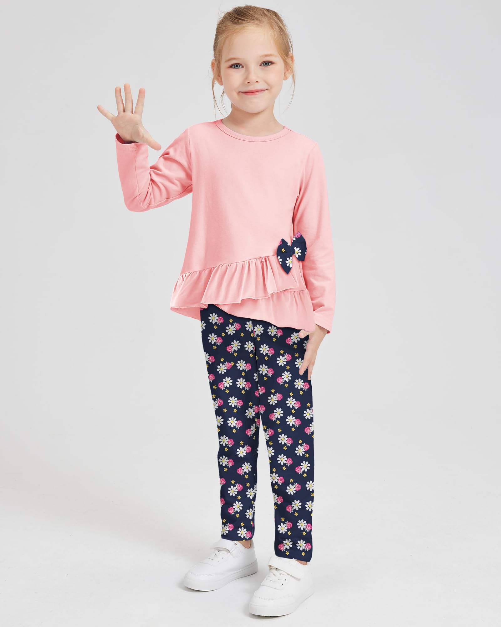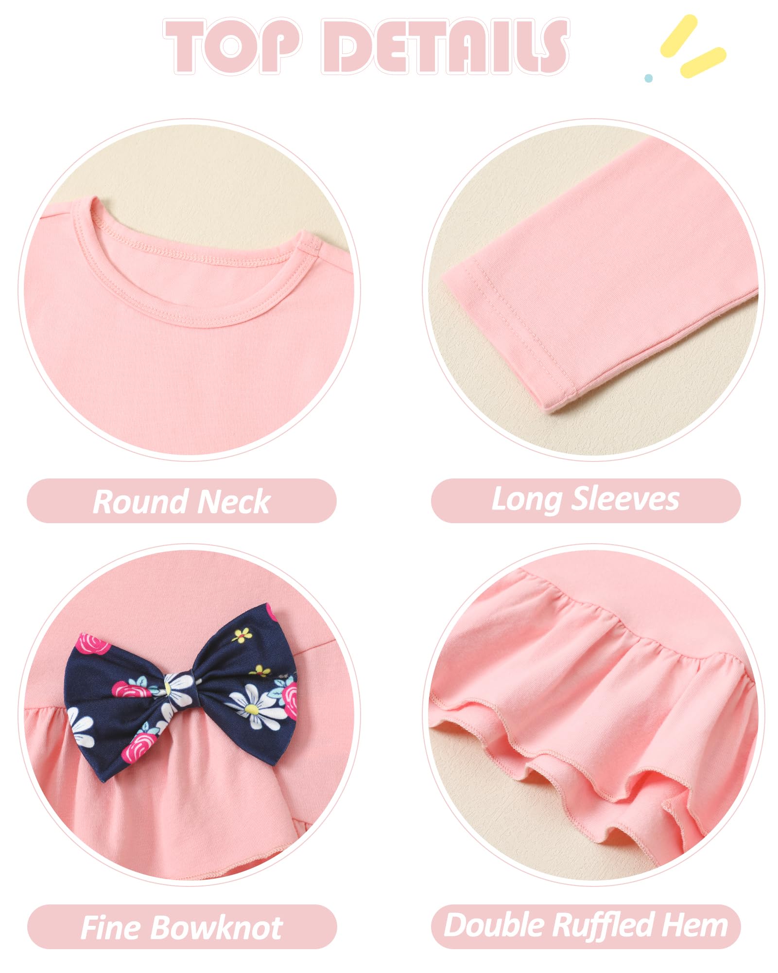 Design: The toddler girl outfit features a long-sleeve top, charming ruffled hem and delicate bow detail, paired with matching floral-print pants. This girls clothes set creates a cute, coordinated look that’s both trendy and timeless