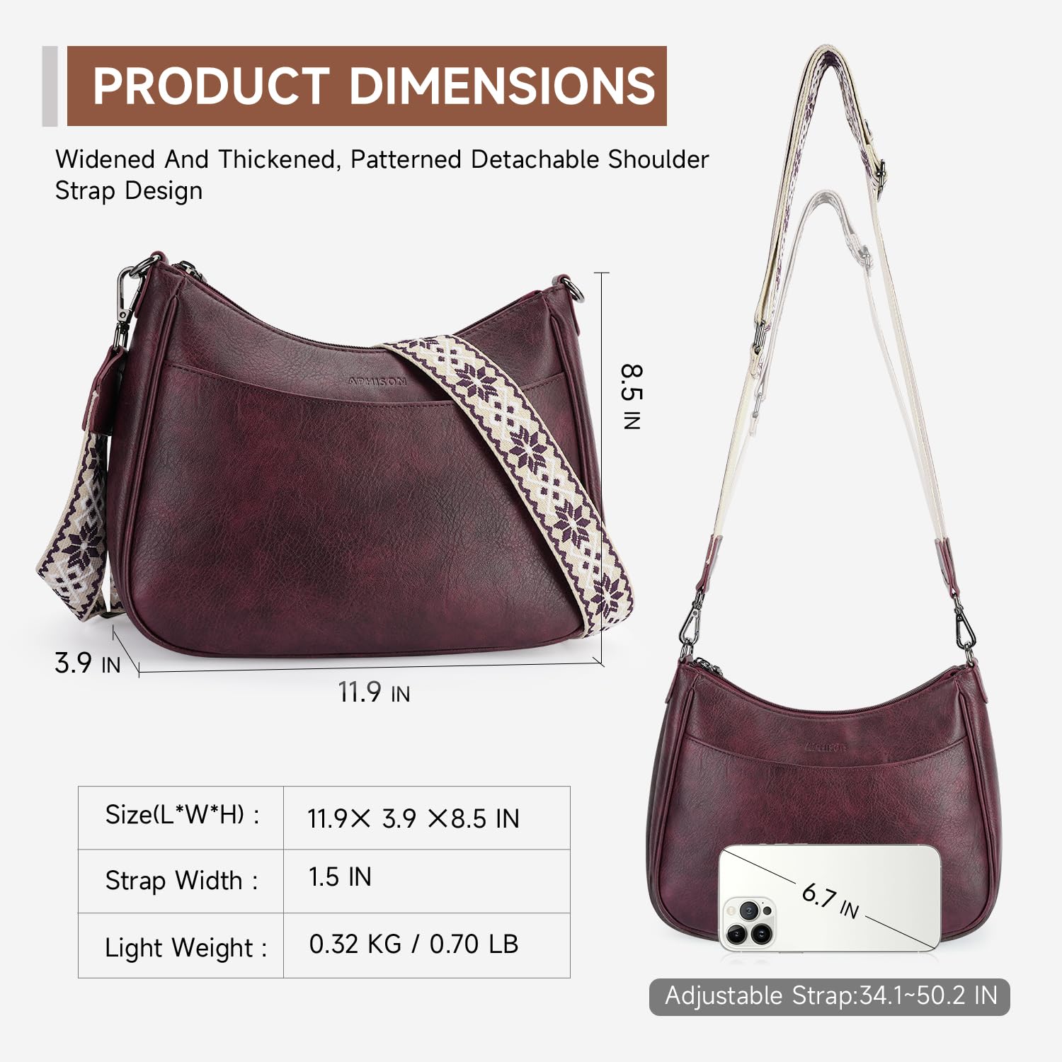 Size: 11.90 inches (L) x 3.90 inches (W) x 8.50 inches (H); Weight: 0.63 lbs; Adjustable strap length: 34.10 to 50.20 inches